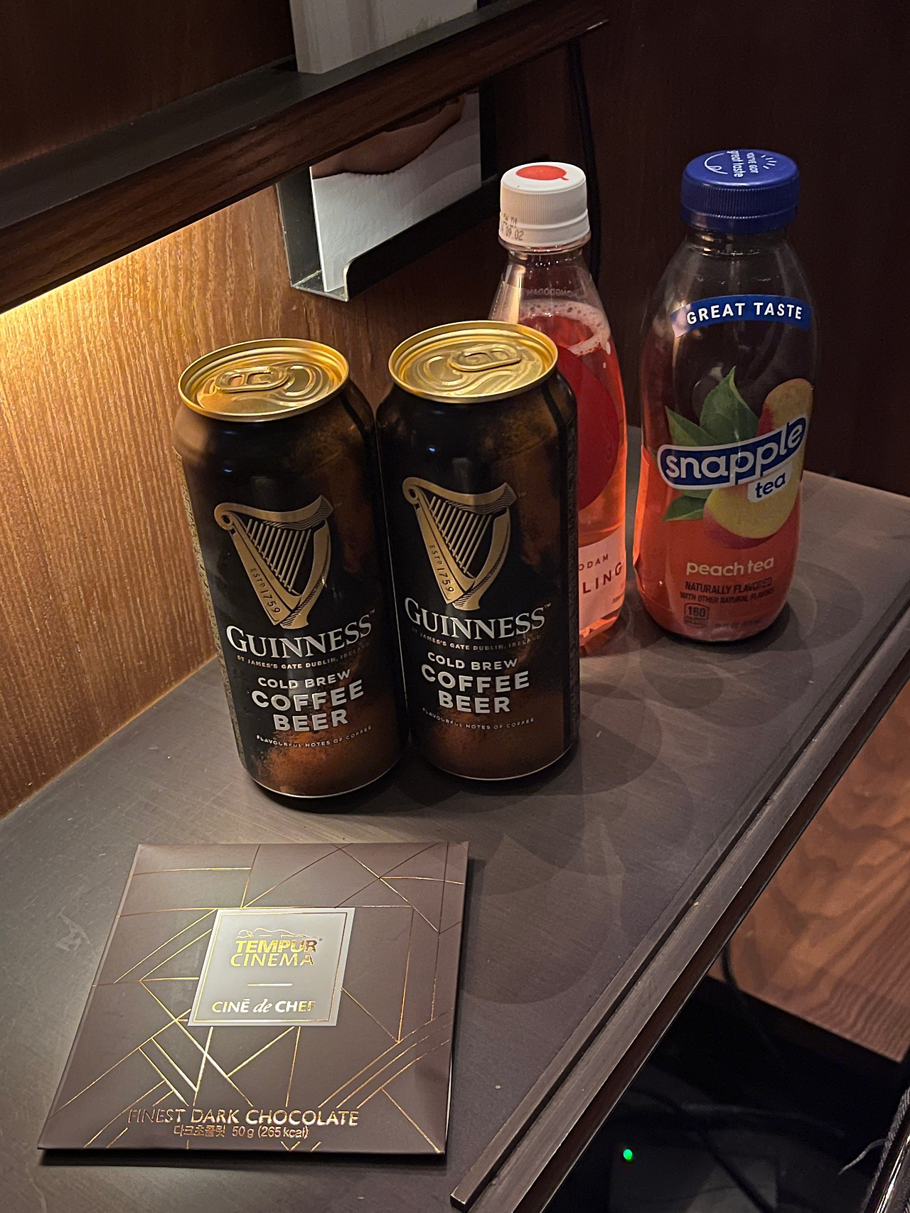또한, 템퍼 시네마에 입장 시 맥주와는 별개로 웰컴 드링크 1잔(아이스티, 탄산수, 물 등)을 고를 수 있으며, 스트레스리스 시네마와 같이 다크 초콜릿 1팩이 증정됩니다. 정말 팝콘과 음료를 사가지 않아도 이렇게 풍성한 스낵이 제공되니 관람 전부터 정말 기분이 좋아졌습니다. 보면서 목마를 일, 배고플 일이 전혀 없이 입도 즐거운 템퍼 시네마 관람~!