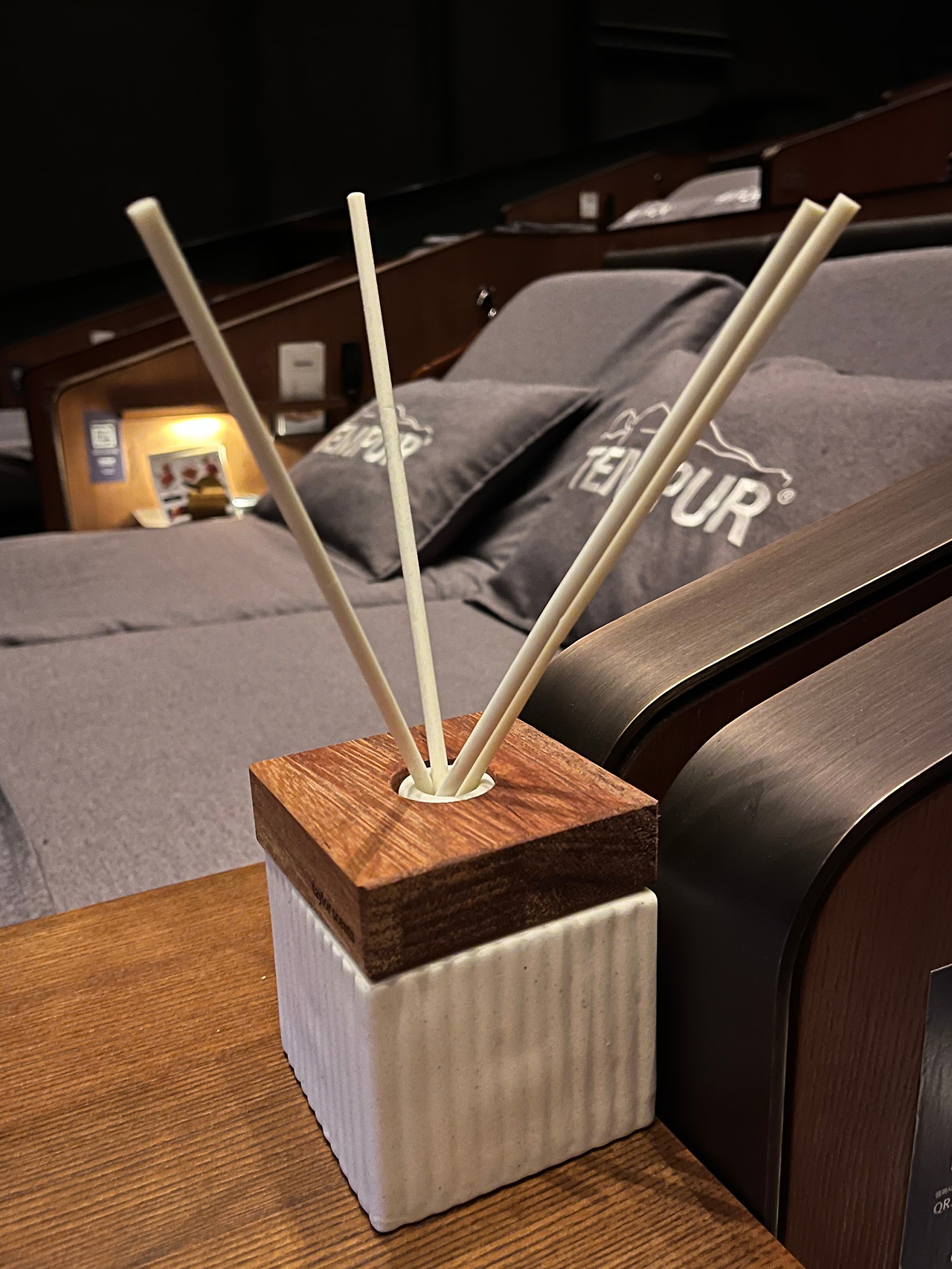 그리고 템퍼 시네마 좌석마다 이렇게 디퓨저가 놓여 있는데요. 상영관을 들어서자마자 정말 좋은 향기가 난다 했더니, 이 디퓨저였습니다. 영화 관람 내내 향이 은은하게 뿜어져 나와서 쾌적하게 관람할 수 있었어요.