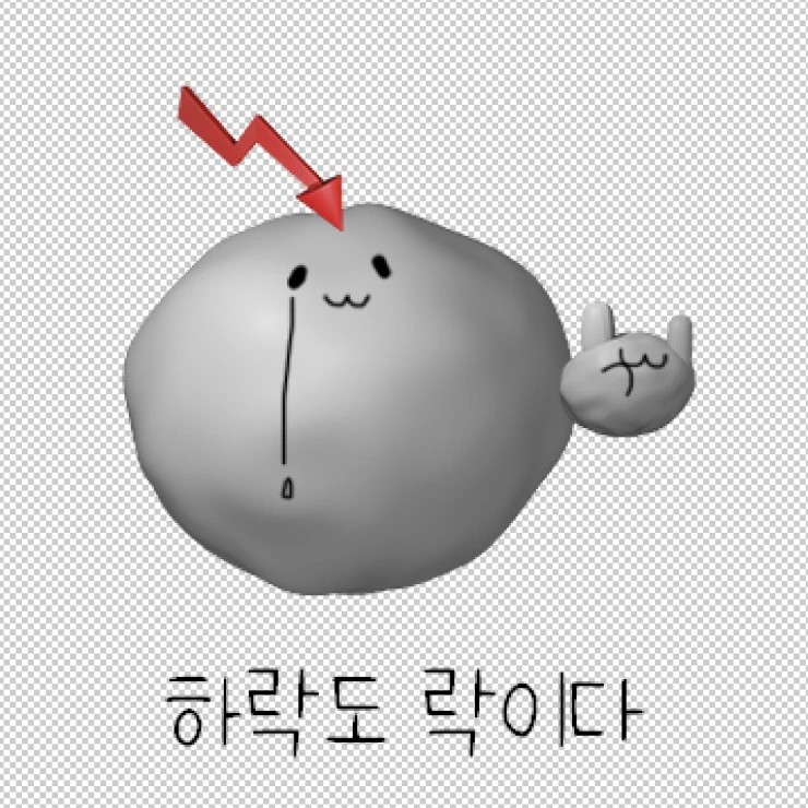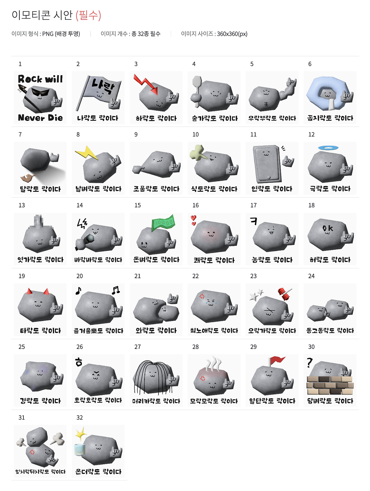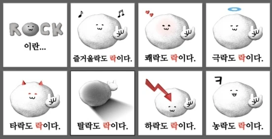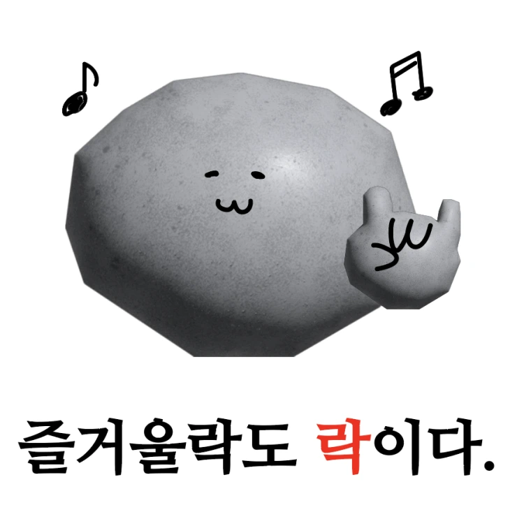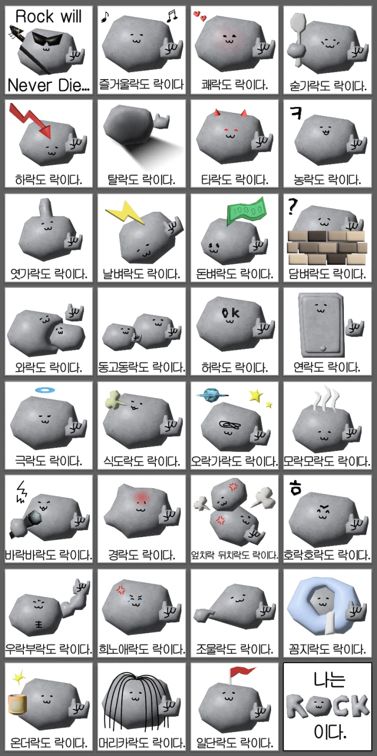 '락'이라는 모듈적 특성을 가지고 있는 이모티콘이었기 때문에 메인 비주얼 에셋인 돌도 모듈의 특성을 살렸다. 비슷한 프레임 안에서 락으로 끝나는 단어에 맞춰 베리에이션을 줬다. 그래서 베리에이션을 주지 않은 디폴트 상태의 돌 에셋이 정말 중요했다. 결국 툴은 다른 방향이긴 하지만 애당초 계획했던 것보다 많은 부분을 훈련할 수 있게 되어, 이모티콘의 완성에 집중하는 것으로 빠른 태세 전환을 했다. 좀 더 능숙하게 다룰 수 있는 일러스트레이터로 넘어와 다양한 시도를 했다.