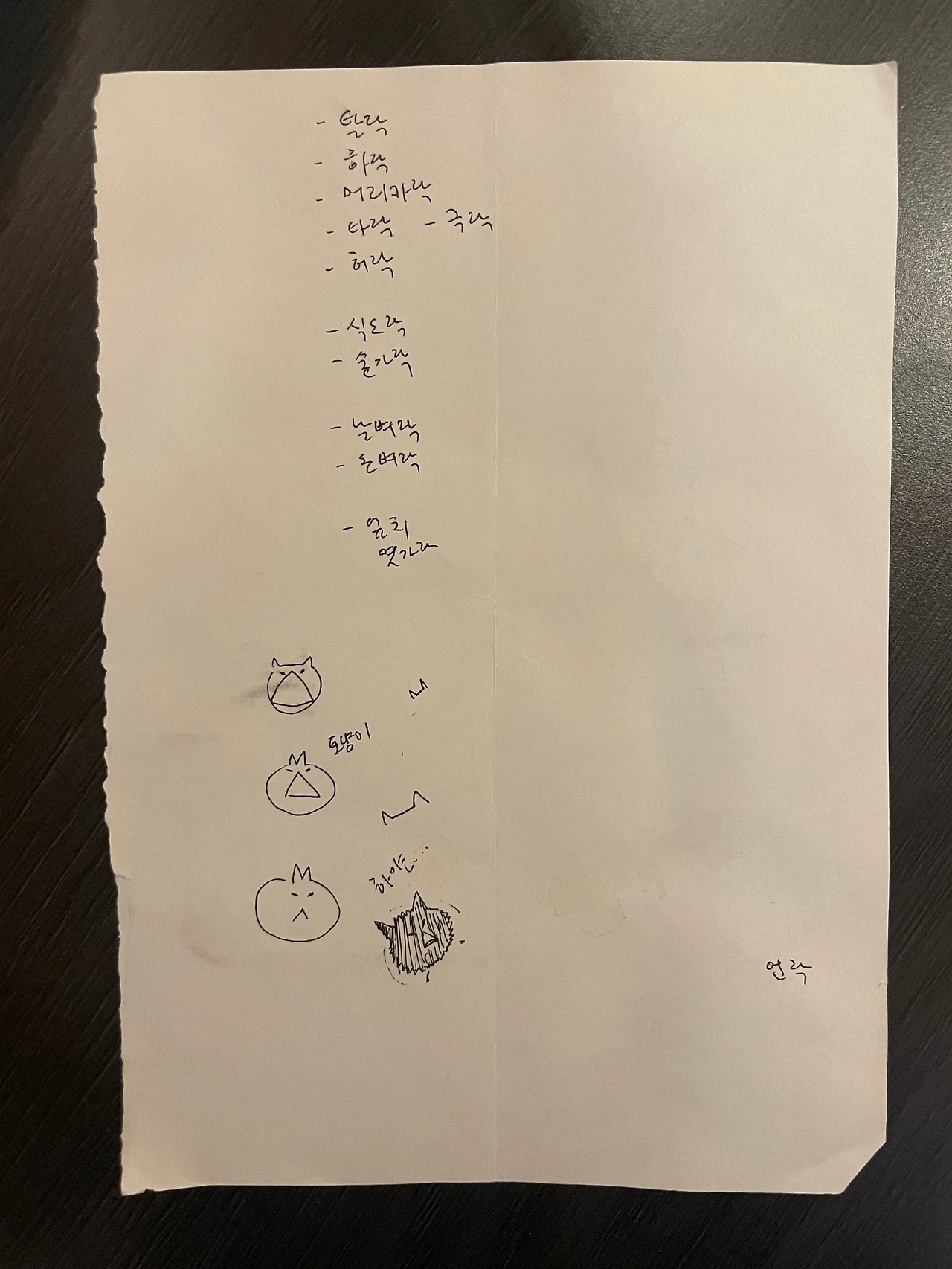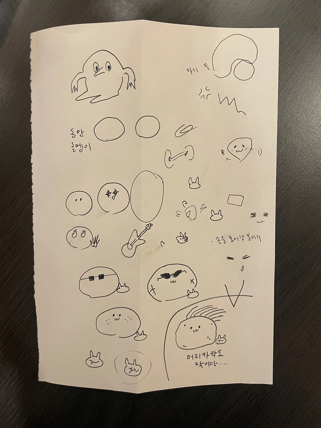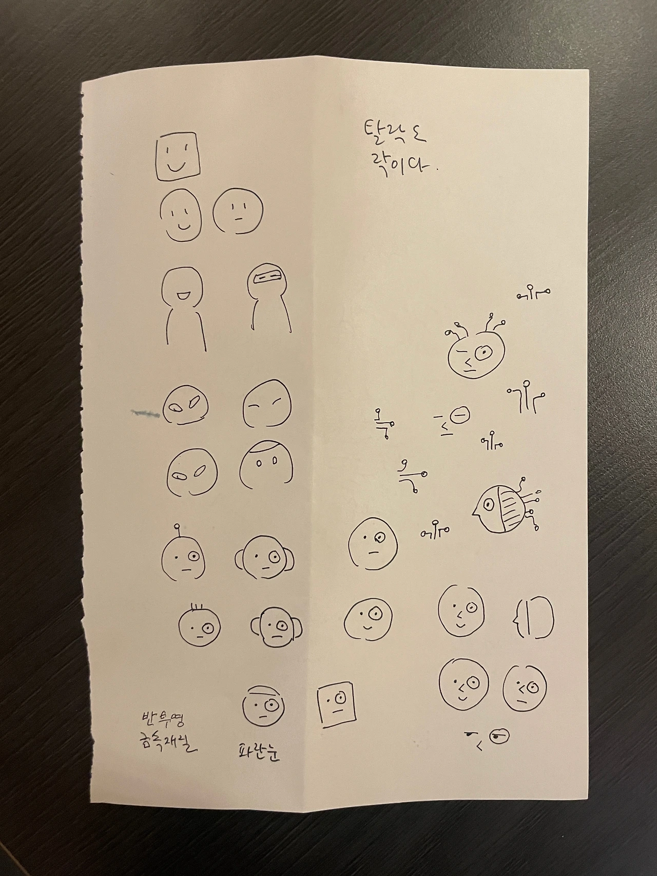 50개 정도의 리스팅을 하다 리프레시가 필요해 잠시 낙서를 했는데 웬걸 이 쪽이 훨씬 마음에 들었다. 그리고 이모티콘 사용 타깃도 나만 쓸 것 같은 AI 콘셉트보다 주변에서 쉽게 발견할 수 있어 상대적으로 폭이 넓다고 느꼈다.