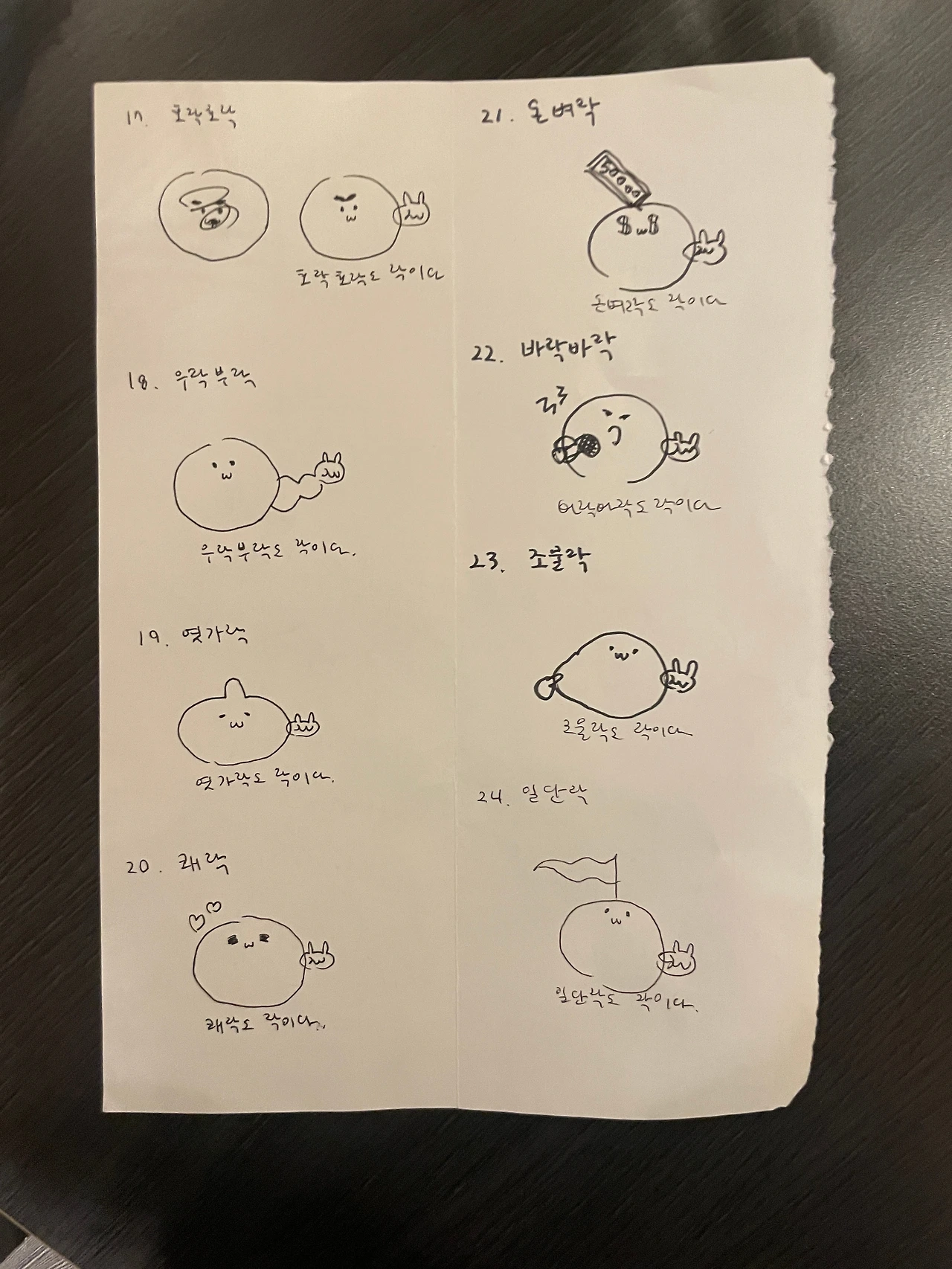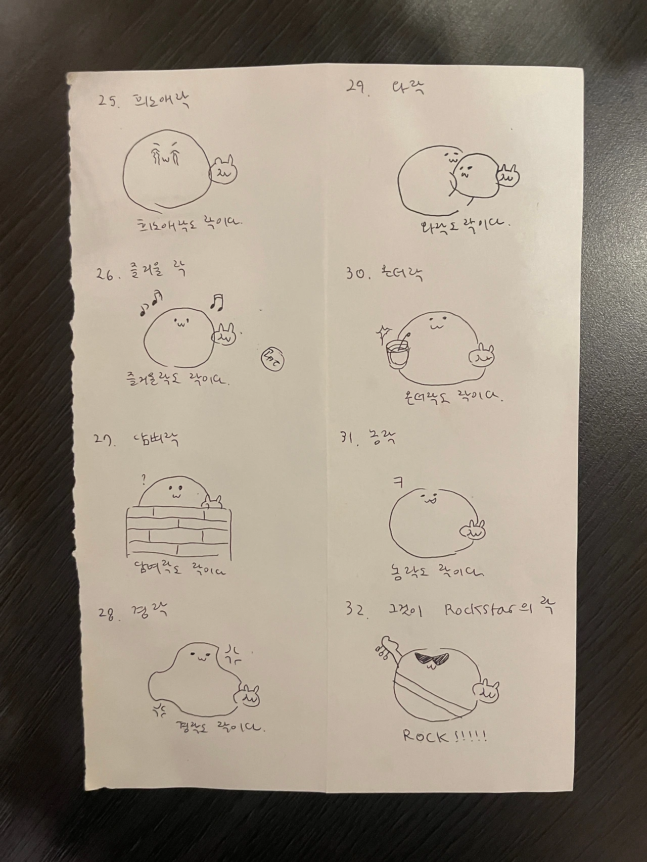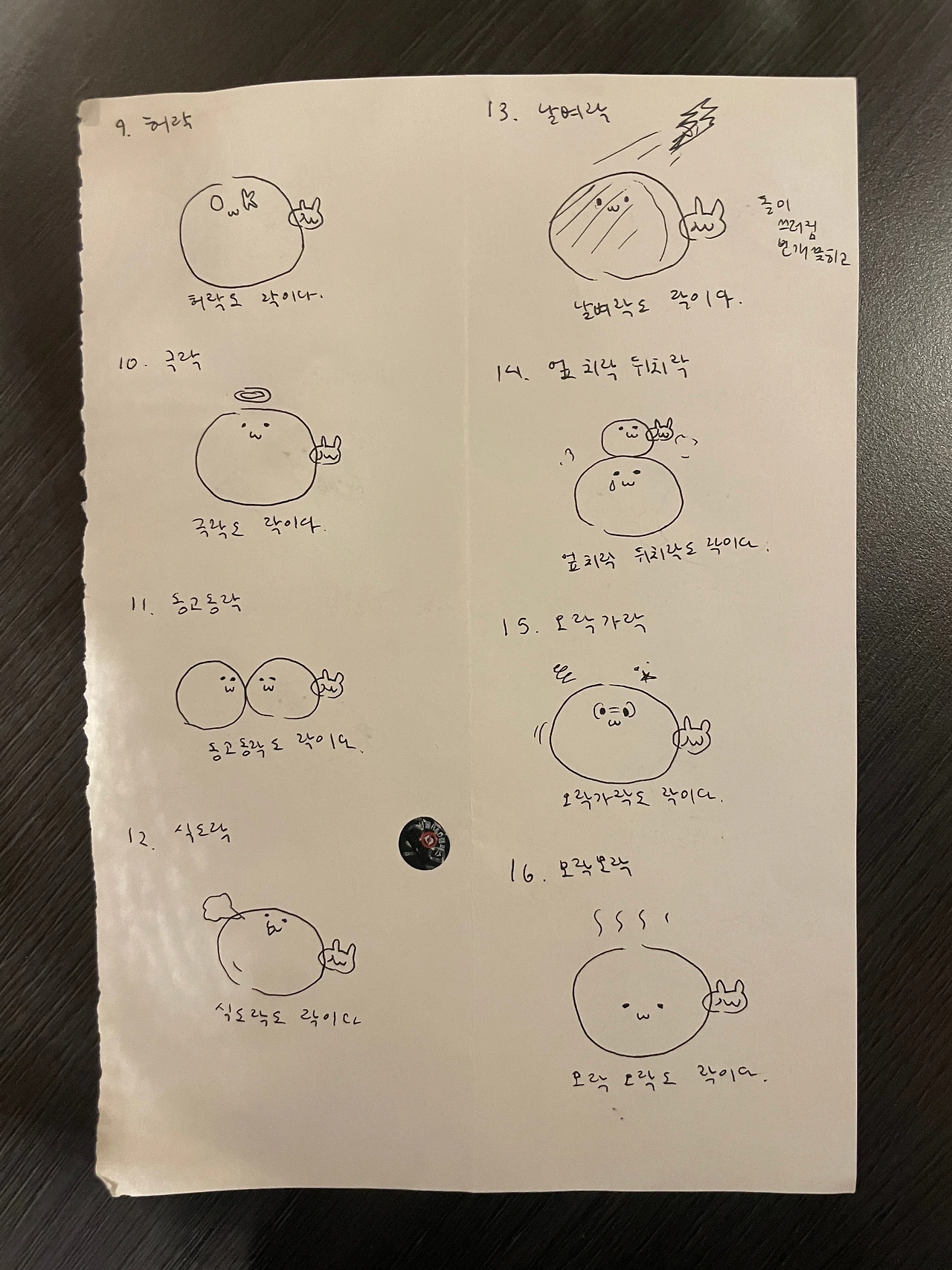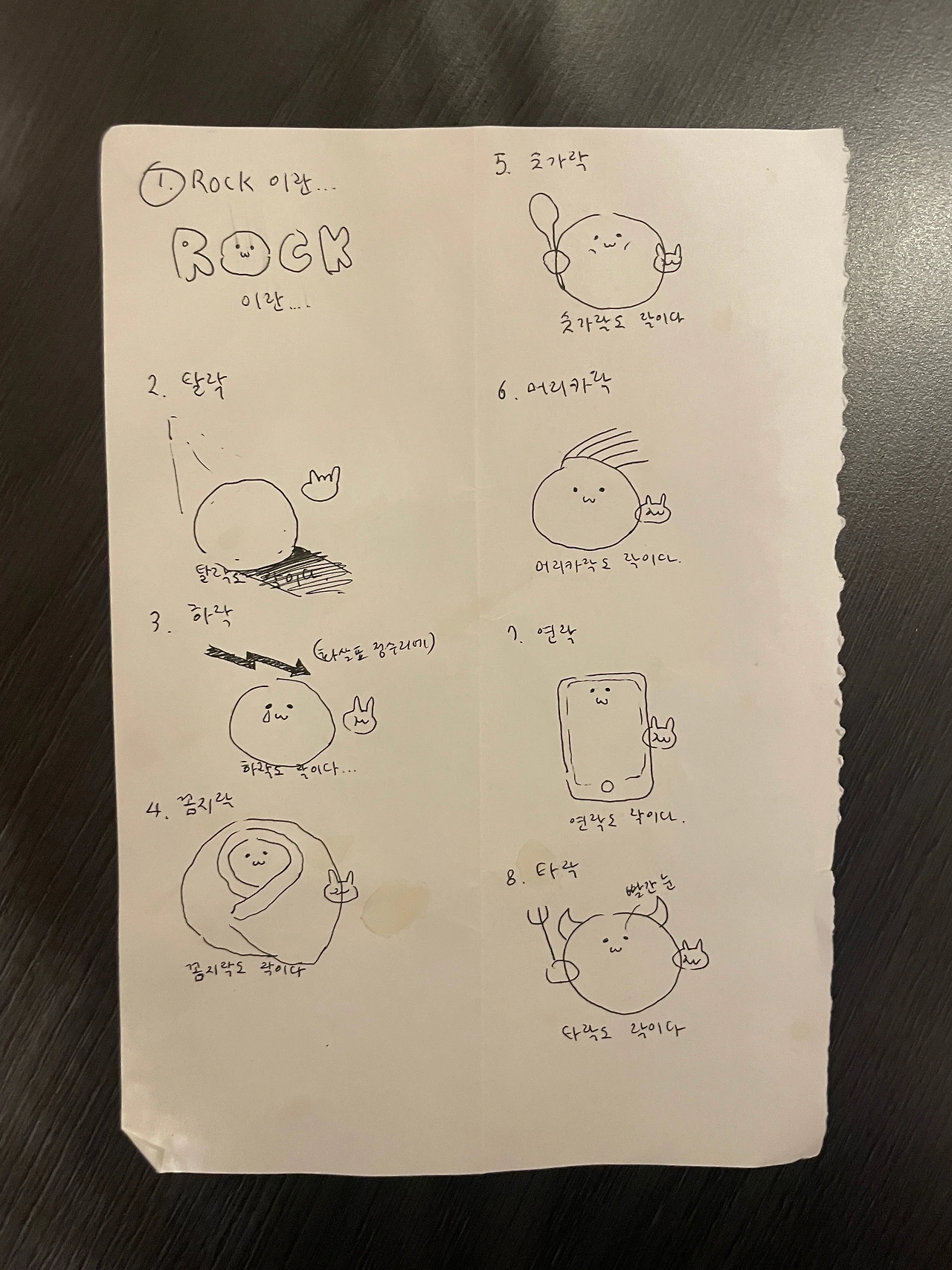 국어사전에 '*락'을 입력하면 락으로 끝나는 모든 단어를 보여준다. 그중 일상적 활용례가 있을만한 단어를 추리고 추려 35개 정도 남긴 뒤 스케치를 진행했다. 생각보다 '락'으로 끝나는 단어 중 일상적인 게 없어 스케치를 보고 직관적으로 전달되는 남은 32개를 걸러내기 위함이었다.