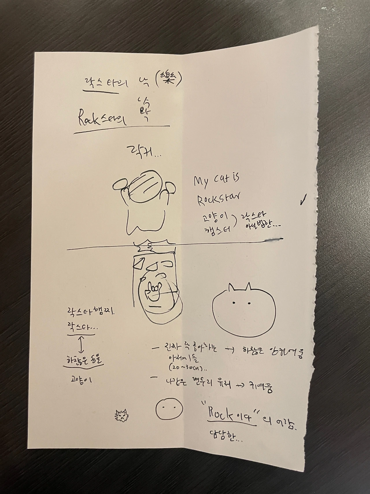 32개의 이모티콘을 모두 디자인하고 폰트를 고민하기 시작했다. 대충 그린 톤 앤 매너에는 어떤 폰트가 어울릴까? 다양한 궁서체, 굴림체, 손글씨체를 시도해 봤다. 심지어 손글씨를 직접 써보기도 했다. 락에는 빨간색을 넣어 강조할지? 말풍선을 그려 다른 선적인 요소와 분리할지? 개성을 살리면서도 손바닥보다 작은 스크린에 띄워질 약 2*2센티미터 내 텍스트에 최대한의 심미성과 가시성을 확보하려는 치열한 고민이 이어졌다.