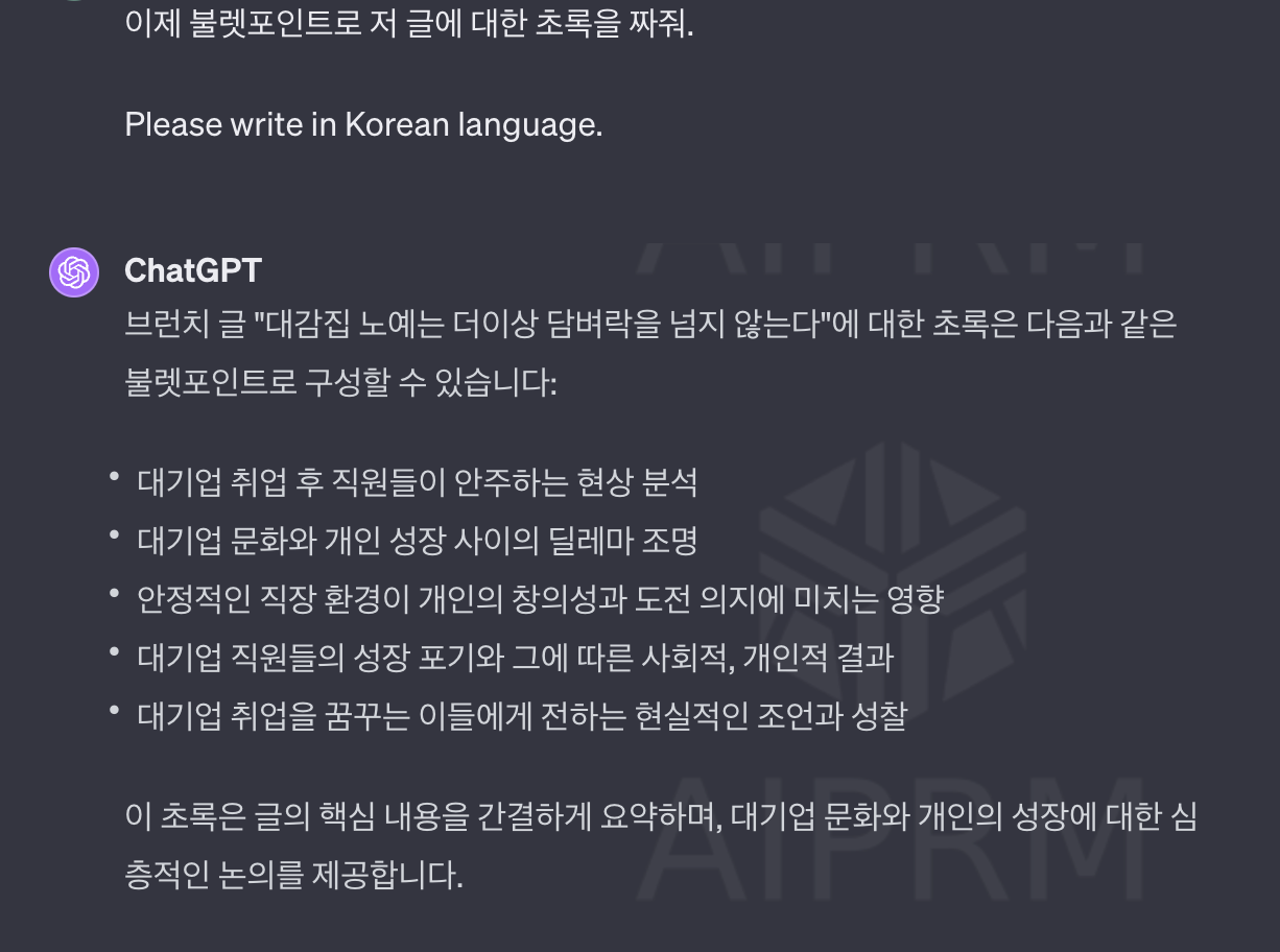 시리즈 컨텐츠들 중 당장 작성하기 쉬운 카테고리를 선택해 목차와 초록을 GPT를 활용해 작성했다. 이후로는 종일 내리 글을 썼다. 효율적으로 가자면 GPT를 이용해 내용까지 생성하고 문체만 내 것으로 수정할 수도 있었지만, 내가 브런치를 하는 마음가짐은 ‘성장하고 싶다’였기 때문에 머리 깨져가며 직접 쓰는 것을 선택했다.
