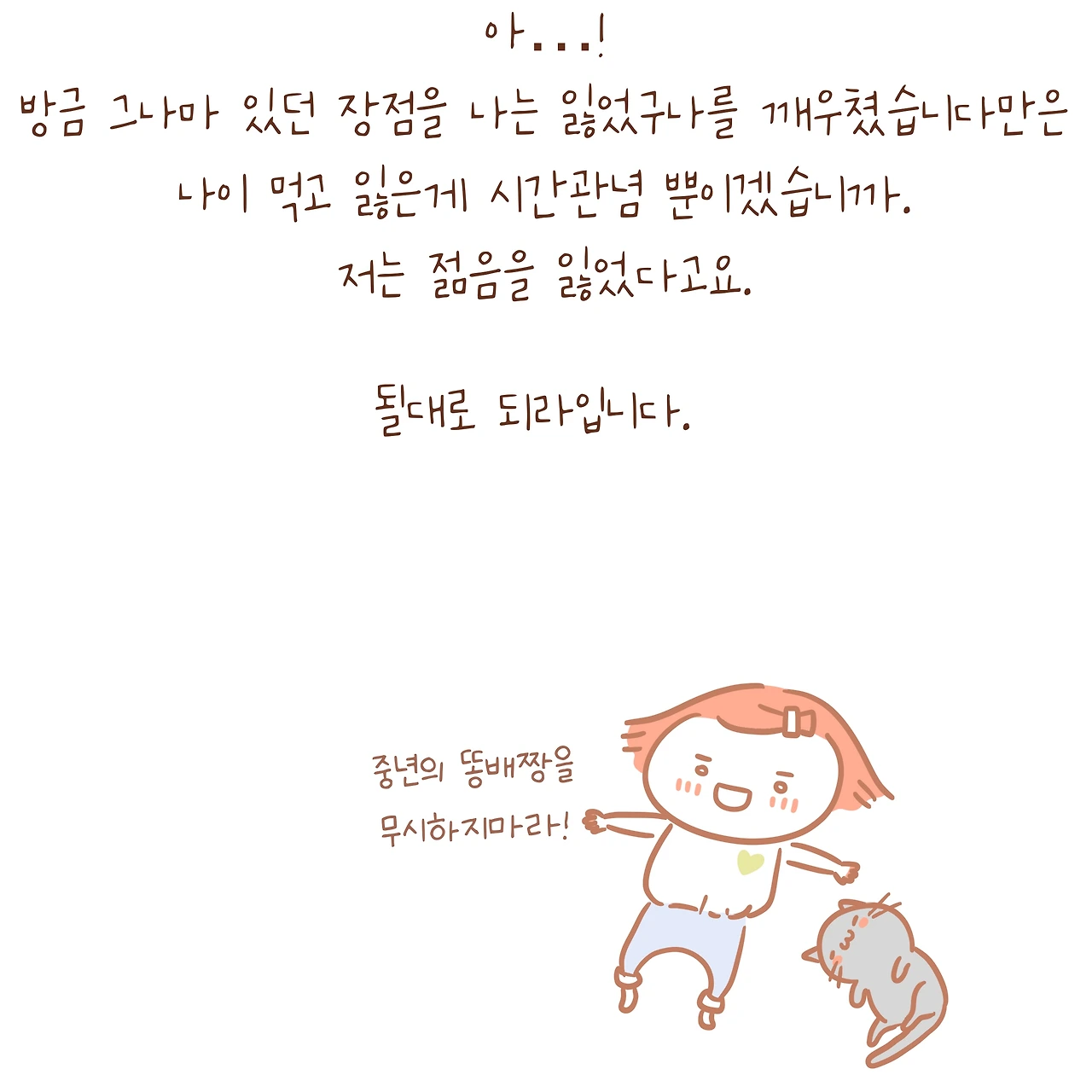 여유롭게 머리를 말리는 친구에게 잔소리를 한다. 머리 빨리 말려라~화장도 얼른 해라~이거 걸치고 빨리 나가라~늦겠다아아아~~아니 벌써 늦었다 이년아!!! 일찍 도착해서 남들 기다리는 시간이 제일 아깝다는 친구에게 집에서 시간 보내나 밖에서 시간 보내나 같은 것 아니냐, 시간이 왜 아깝다는 거야, 이해를 못 하겠다며 잔소리를 하고 등짝을 백번쯤 후려 친 뒤에 겨우 밖으로 내 보낸다. '제시간에 도착해야 할 텐데… ' 간당간당한 시간에 나간 친구를 걱정하며, 아니 정확히는 늦게 도착할 친구 때문에 기다리게 될 친구의 친구를 걱정하며 혼자 남은 집에서 벌러덩 누워 텔레비전을 켠다. 요즘 가장 핫한 드라마가 재방송된다. 이미 본방사수 한 드라마지만 재밌으니 또 본다. 드라마를 다 보고 나니 마음 한구석이 찜찜해진다. 일해야 하는데… 마감이 얼마 남지 않은 학습만화를 얼른 그려야 하는데 왠지 하기가 싫다. ‘아직 마감기한이 조금 남아있으니까…’ 마음 한 구석은 불안하지만 내일의 나에게 일을 미룬다. 반쯤 읽다가 구석에 던져둔 책을 가져와 읽기 시작한다. 화장실에 한 권, 방에 한 권, 텔레비전 옆에 한 권.. 나는 책을 여기저기 두고 손에 잡히면 읽곤 했다. 한 권을 진득하게 읽은 적이 없다. 내가 던져둔 책들과 친구가 던져둔 책들로 집꼬라지가 엉망이다. 하지만 어쩔 수 없다. 내가 치워도 친구가 던져 놓는다. 친구가 치워도 내가 던져 놓는다. 집은 늘 엉망진창이다. 하지만 나만 맨날 청소할 순 없잖은가. 그렇다고 친구에게 매일 치우라고 할 수도 없고. 그냥 엉망진창인 집에 살면서 스트레스를 받지 않는 마음 상태 유지하는 것, 이게 가족 아닌 친구와 살면서 터득한 삶의 지혜였다. 책을 읽지만 딱히 재미가 없다. 마음 한구석에 곧 다가올 마감이 계속 걱정이다. 뭐라도 그려야 하는데…. 어떤 아이디어도 떠오르지 않는다. 뭐~마감이 닥치면 하겠지. 여태껏 늘 그랬다. 어찌되었든 마감시간은 지켰다. 다시 말하지만 나는 평생 단 한번도 약속시간을 어긴 적이 없었다.