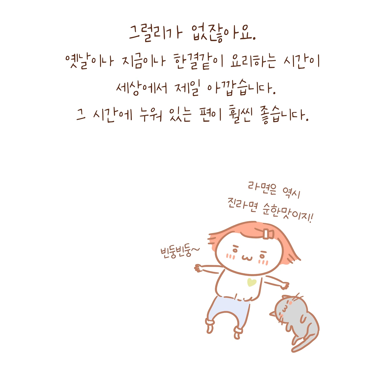 약속시간에 진심인 나와 요리에 진심인 친구는 그렇게 5년을 같이 살았다. 내가 결혼을 하지 않았다면 아직도 그러고 살고 있었을거다. 그녀는 여전히 나를 만날때 늦게 나오고 나는 남편이 만들어 둔 반찬으로 밥을 먹는다. 반찬이 없으면? 라면 먹지 뭐~