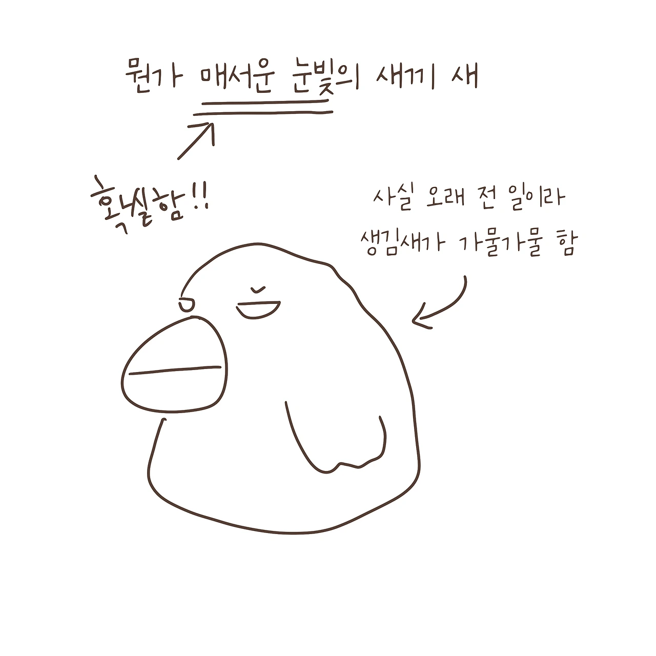 무표정한 표정으로 지하철역을 향해 묵묵히 걸어가고 있던 아침이었지요. 무념무상의 상태로 기계적으로 걷다가 순간 발밑에 있는 작은 새를 발견하고 ‘허억’하고 놀라는 동시에 오른발을 잽싸게 옆으로 디뎠습니다. 참새보다 약간 더 큰, 출신을 알 수 없는 여하튼 솜털 보송보송한 새끼 새였습니다. 근처 가로수에 터를 잡으신 어떤 새의 새집에서 낙하하신 것이 아닐까 추정이 되었지요. 저는 울지도 않고 가만히 앉아있는 새끼 새를 잠깐 살펴보곤 살포시 옆으로 돌아서 지하철역을 향해 다시 걷기 시작했습니다. 그런데 걱정이 되더라고요. 조상이 도시에서 나고 자란 새인지 그 새끼 새의 털 색깔은 보도블록과 완벽한 보호색을 이루어 눈에 잘 띄지 않았거든요. 목적지인 지하철역을 제외하곤 눈에 보이는 것이 없는 무념무상의 아침 출근길의 수많은 직장러들의 발에 의도치 않게 밟히기 딱 좋을 색깔이더란 말입니다. 저는 피했지만 제 뒤에 오는 누군가의 발에 밟힌다면? 차인다면? 크흑… 상상만 해도 새끼 새와 사람, 둘 모두에게 불행한 일이 아닐 수 없었습니다. 저는 다시 돌아가서 가만히 앉아있는 새끼 새를 움켜… 아니 살포시 쥐었습니다. 태어나서 처음으로 새를 쥐어봤어요. 생각보다 엄청 보드라웠고, 가벼웠고, 엄청 시끄러웠습니다. 제가 잡자마자 새끼 새는 도시가 떠나가라 울어재끼더군요.