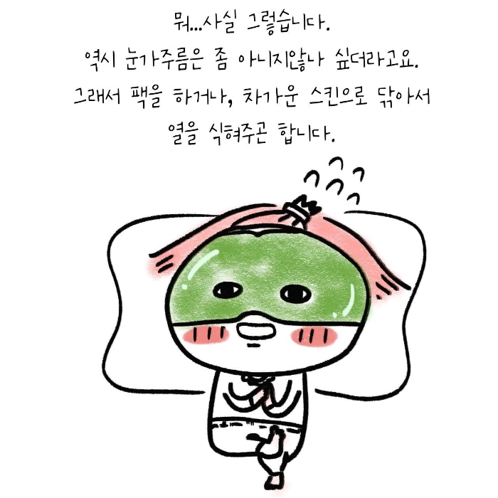 얼굴에 열이 1도만 올라도 피부가 상해서 주름이 생기니 얼굴의 온도를 내려줘야 한다는 화장품 광고를 여름만 되면 봤었던 것 같다. 생각해보니 여름철 화끈화끈해진 얼굴에 오이며, 알로에며, 냉장고에 넣어둔 쿨링팩 등을 얼마나 붙여댔었냔 말이다.. 전문가가 아니라 자세한 것은 몰라도 피부 관리를 위해선 열 받으면 안 된다는 것은 이미 시나브로 학습되었나 보다. 금이야 옥이야~애지중지하며 피부를 차갑게 만들어줘도 모자랄 판에 45도의 열을 아침저녁 15분씩, 그것도 내 손으로 가장 연약하다는 눈가에 갖다 대다니!!!