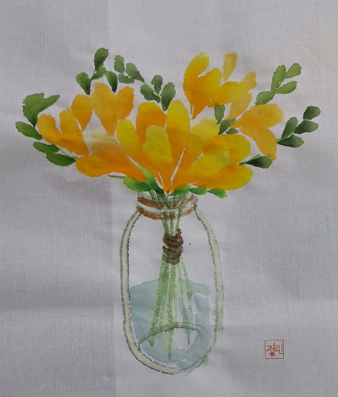 프리지아 두 단이 오천 원이란다. 오랜만에 생화를 샀다.
