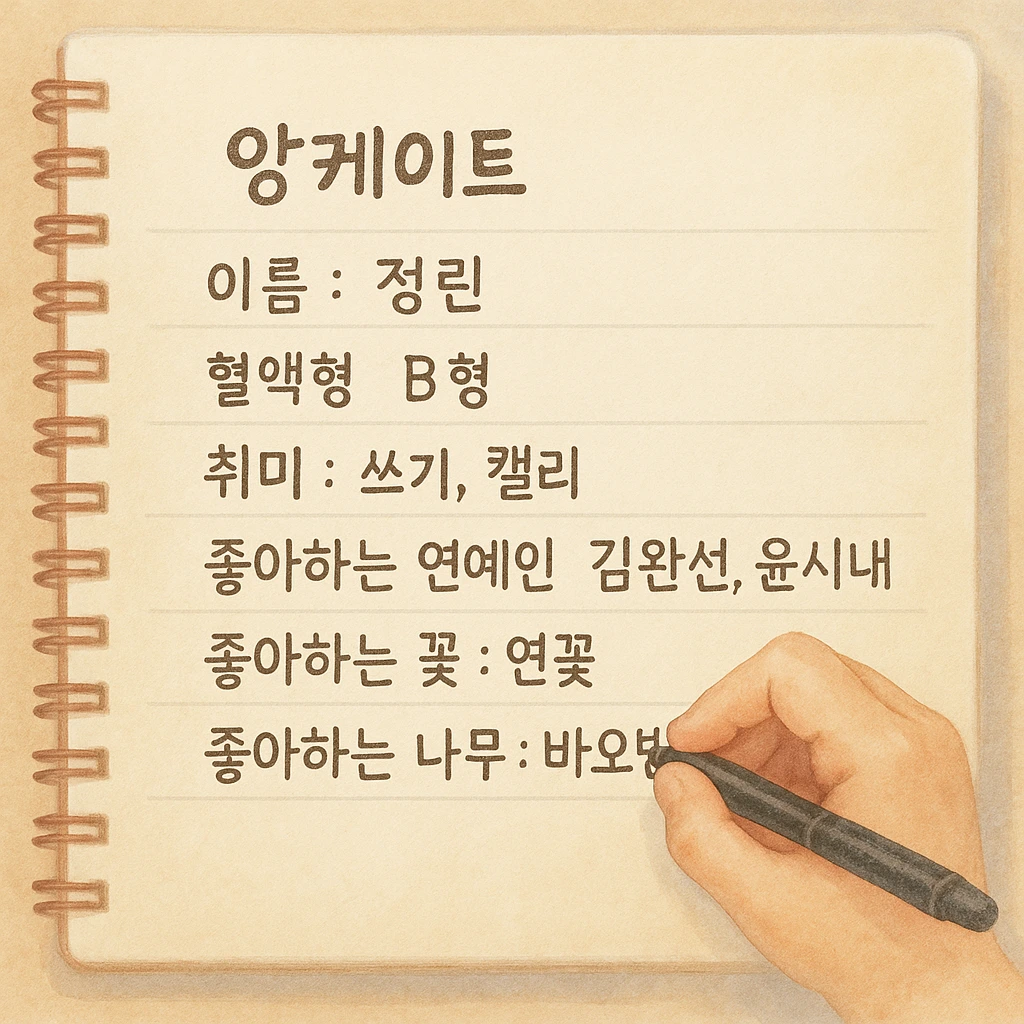 “이름, 성별, 별명, 취미, 특기, 혈액형, 좋아하는 연예인, 좋아하는 꽃” 같은 질문을 써서 친구들과 주고받던 기억이 있다.