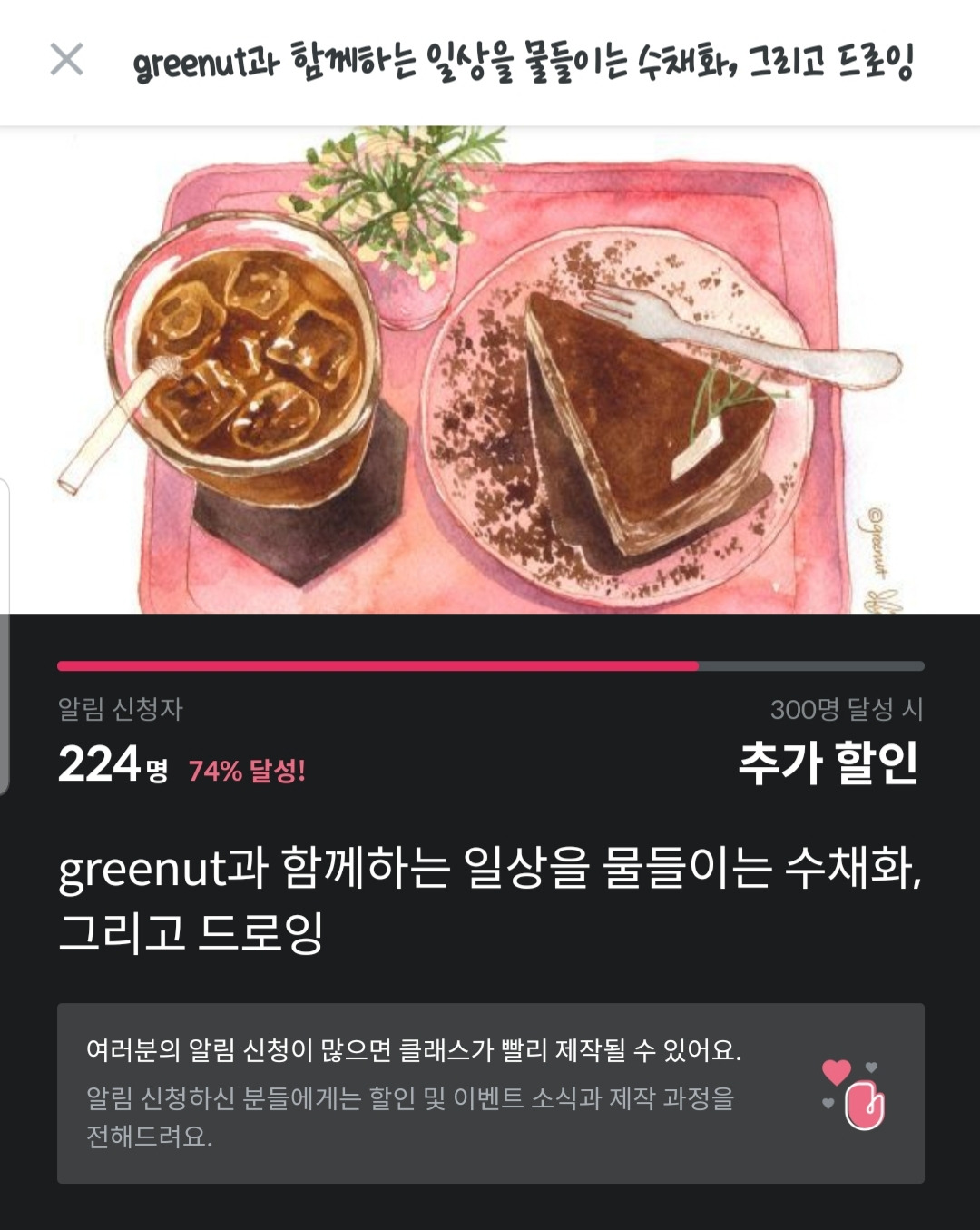 수업 신청은 https://101.gg/greenut-class <- 여기로 들어가시면 하실 수 있고요. 시간/공간적 제약 없이 그림 수업을 수강하고 싶으신 분들의 많은 참여를 기다리겠습니다. 부디 빠른 수업 개설이 될 수 있도록 여러분의 많은 관심 부탁드려요. 항상 감사합니다. :)