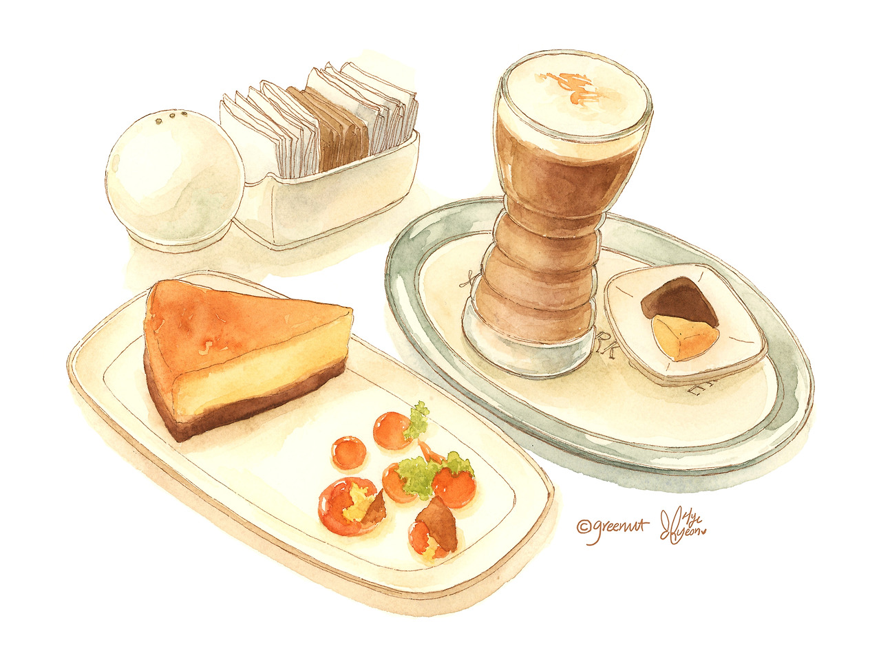 뉴욕라떼 마끼아또에 살구잼과 치즈 케이크의 달콤함과 직접 연주해주는