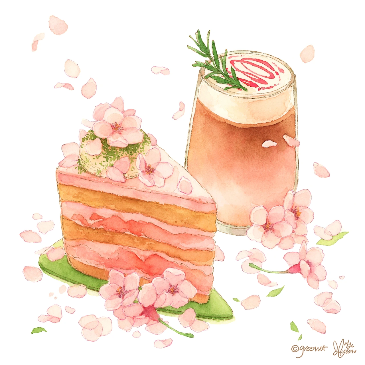 벚꽃 감성이 가득한 날에 잘 어울리는핑크라떼와 달콤상큼한 벚꽃 자몽케이크.-벚꽃 감성이 가득한 날2019 / 200 x 200 mm / Pen, Watercolor on paper©greenut(Hye ryeon Kim)