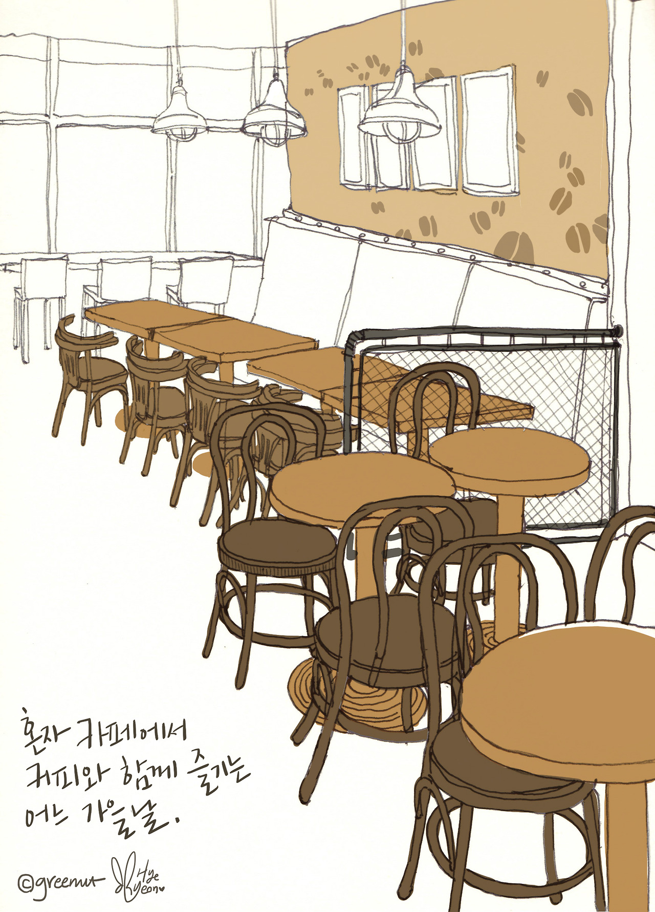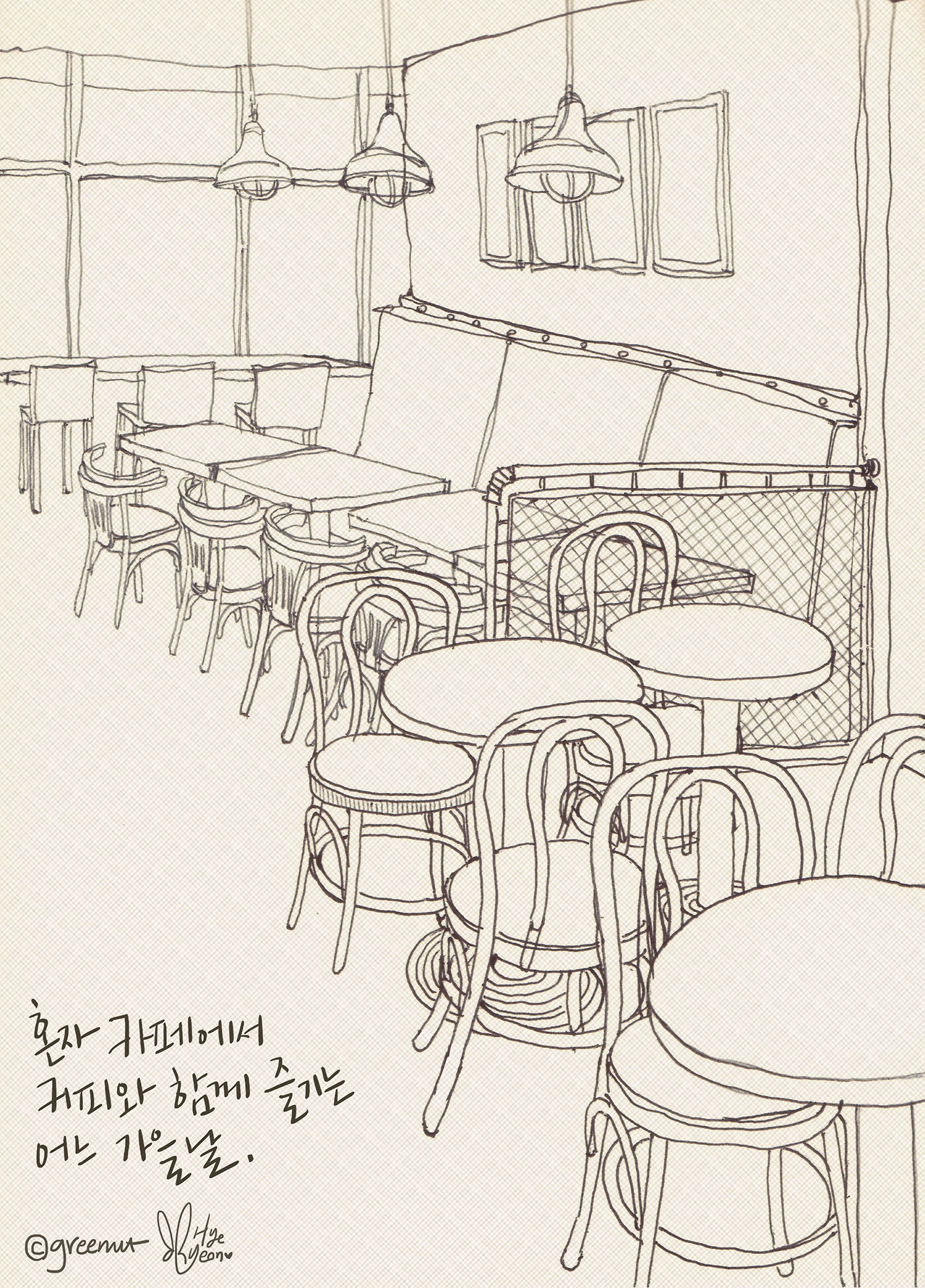 천안 더카페(The caffe)에서, 하네뮬레 드로잉북에 볼펜으로 그림.