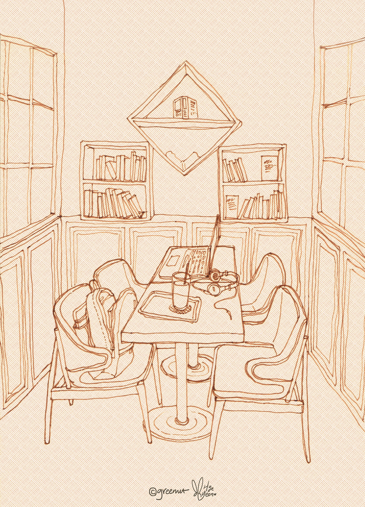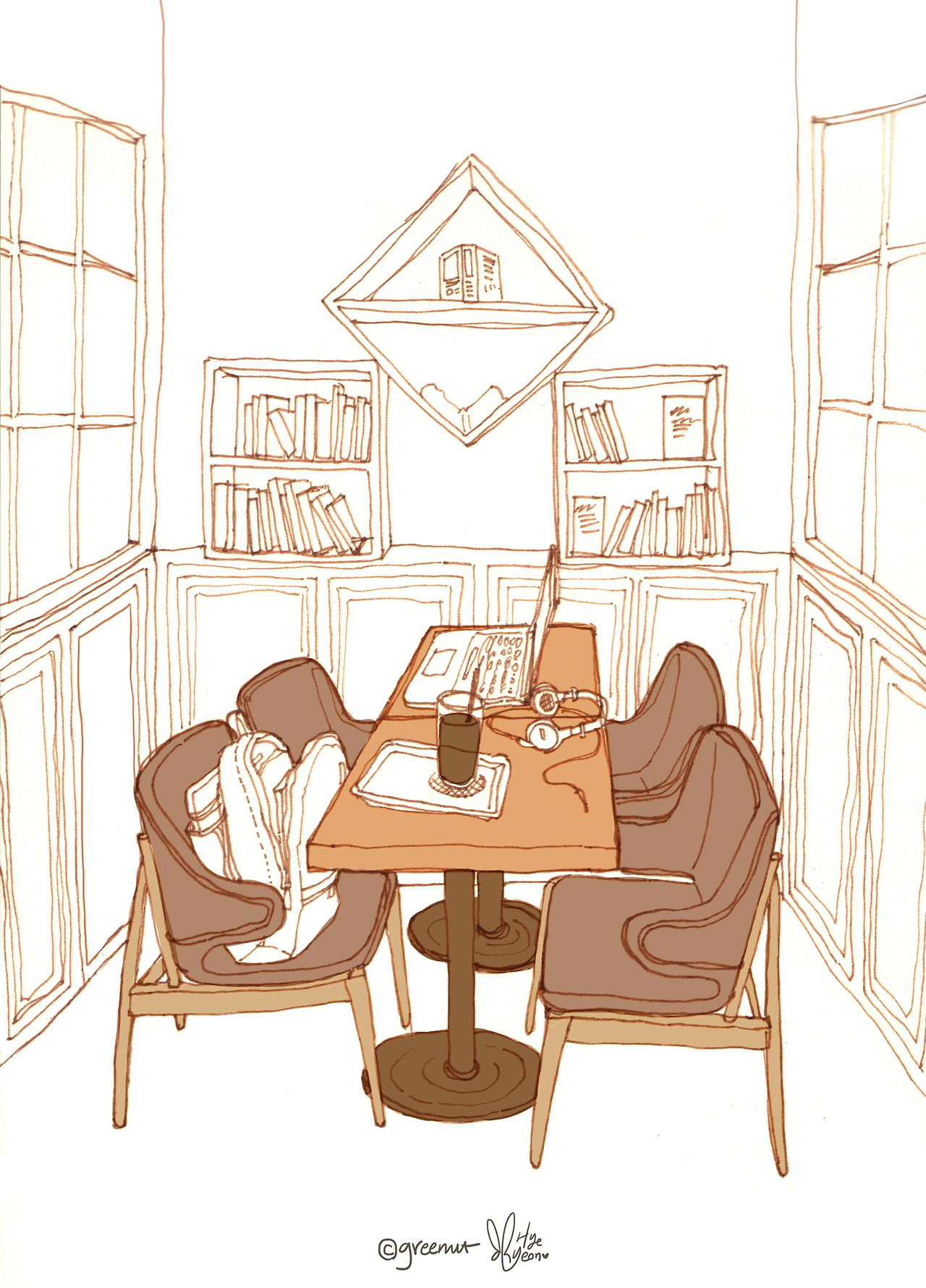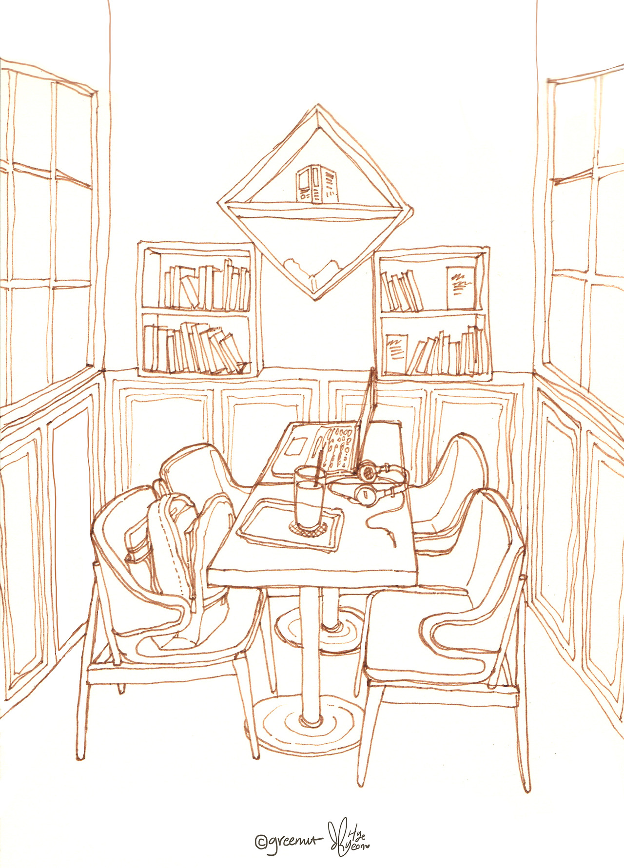 카페 세나클에서, 하네뮬레 드로잉북에 코픽 멀티라이너로 그림.
