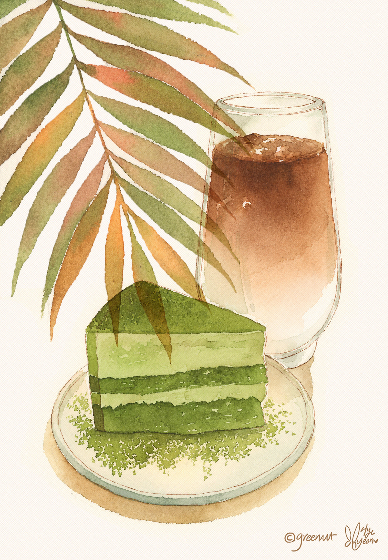 라떼 한 잔과 말차 케이크 한 조각을 즐긴다.