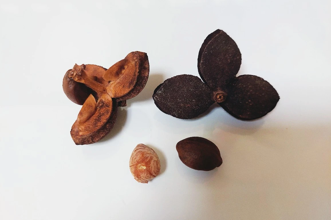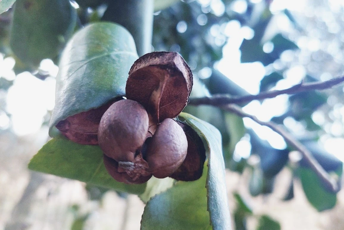 꽃망울 들여다보다 활짝 벌어진 열매 깍지를 봤다. 껍질이 두껍고 딱딱하고 단단하다. 씨앗이 대부분 빠져나가고 없는데 어떤 것은 아직도 암술대를 꼭 부여잡고 있다. 동백 씨앗은 처음 보았다. 한 개의 열매에 세 개의 씨앗이 들었고 무당벌레 형태에 잣처럼 고급 진 갈색 겉껍질에 싸여 있다. 이 껍질도 단단하여 잘 쪼개지지 않는다. 집에 와 쪼개보니 속껍질 입혀진 씨앗이 나온다. 정말 야무지게도 감싸 두었다. 나무는 씨앗을 지키느라 싸고 또 싸도 사람은 싼 것을 풀고 풀어 먹고 기름을 짠다. 기름 넉넉히 얻을 만한 크기라 사람은 재미지겠다. 요즘엔 동백기름을 머리는 물론 피부에도 바르고 먹기도 한단다. 나는 그냥 씨앗이 예뻐 몇 개 주워 와 참나무, 잣나무, 조각자나무, 편백나무 등등의 씨앗이 들어있는 작은 병에 담아 두고 오래 보기로 했다.