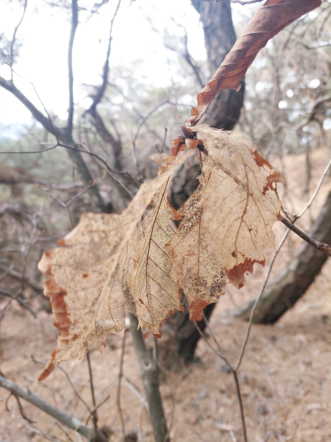 피부 한 겹이 벗겨져 나간 듯한 신갈나무 잎사귀를 보았다. 도탑던 면직물이 하늘하늘 레이스가 된 것 같은 느낌이다. 세파에 시달린 섬세한 잎맥이 고스란히 드러나 있다. 퇴색하고 바랜 것이 전하는 아름다움을 오래 바라보았다. 잘 늙을 일이다.