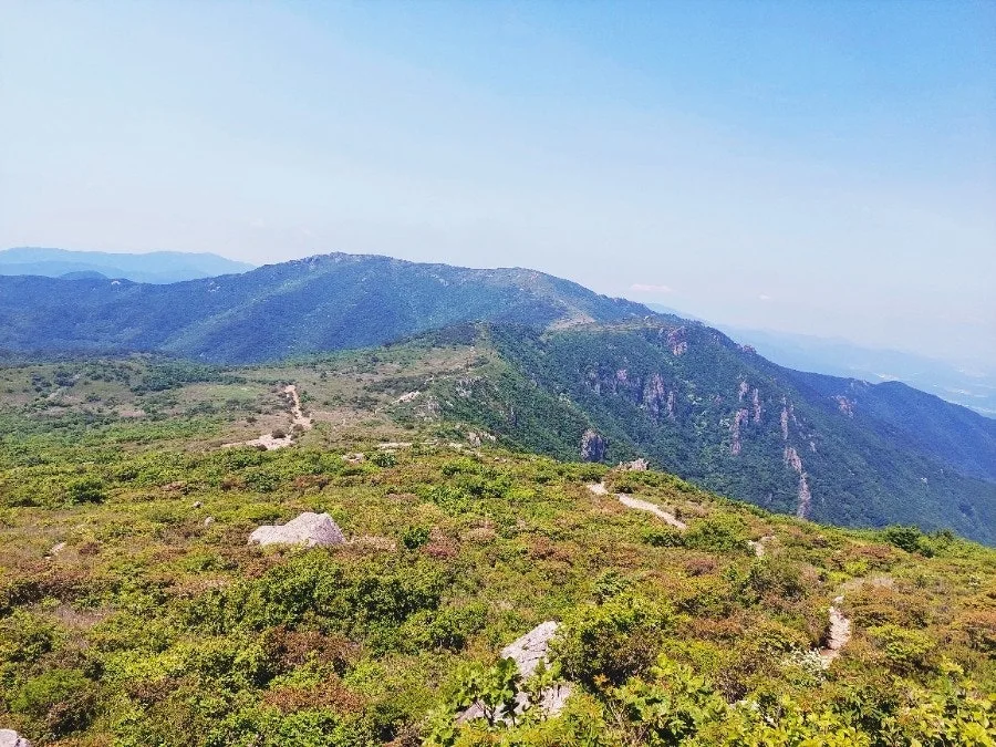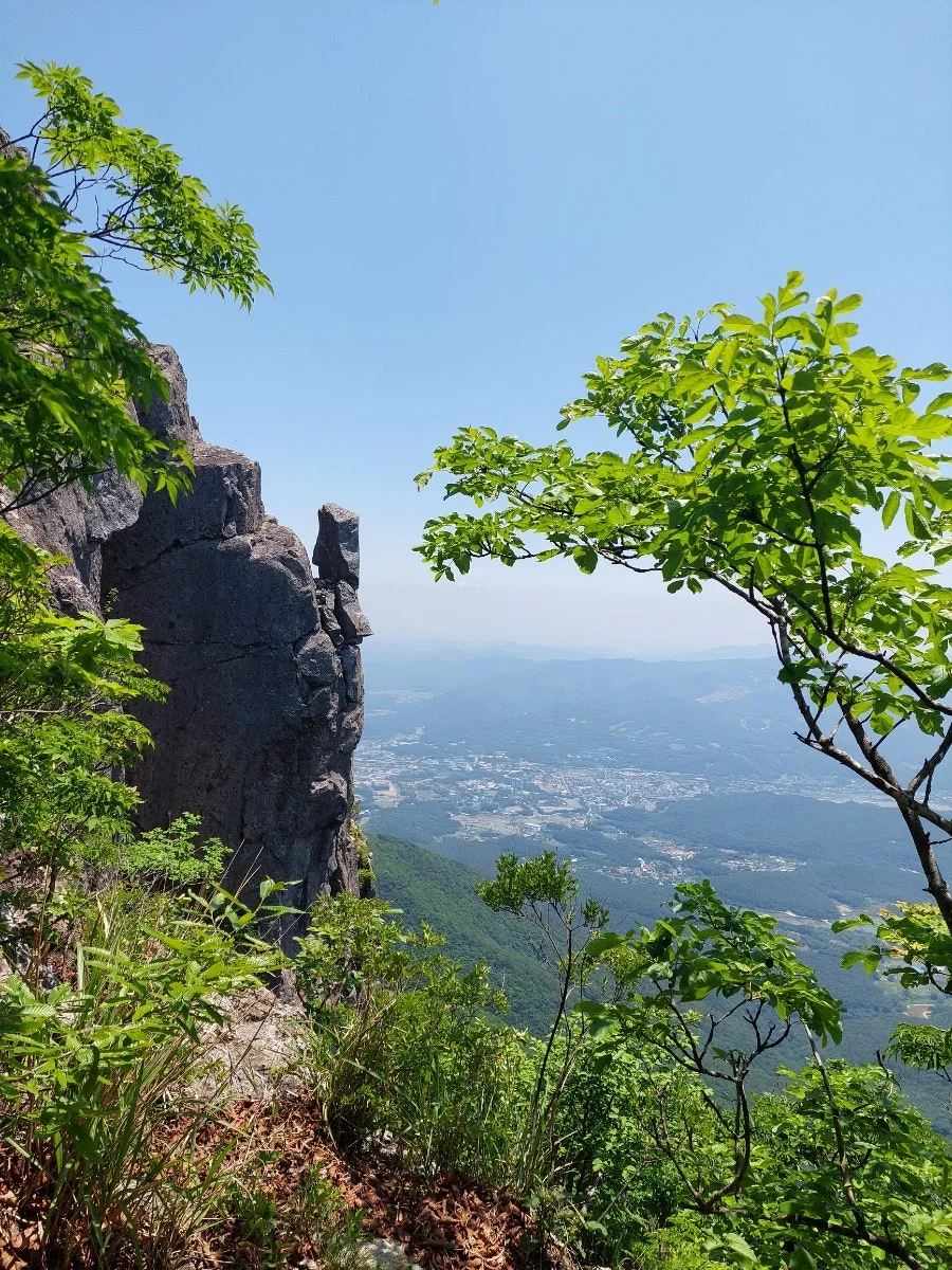 함박등까지도 오르막이다. 꽃 한 송이 없고 특별한 나무도 없고 조망도 없는 조금은 심심한 길. 그러다가 갑자기 큰 바위가 눈앞에 나타나고 그 바위를 오르니 드넓은 세상이 사방으로 펼쳐진다. 아, 좋다! 그저 나오는 환희의 감탄사 외에 달리 무엇으로 표현하겠는가. 초록 양탄자가 깔린 능선과 우뚝 솟은 바위와 산 아래에 펼쳐진 논밭과 사람의 마을과 싱그러운 오월의 햇살, 더 바랄 것 없는 기쁨이 샘솟는다.