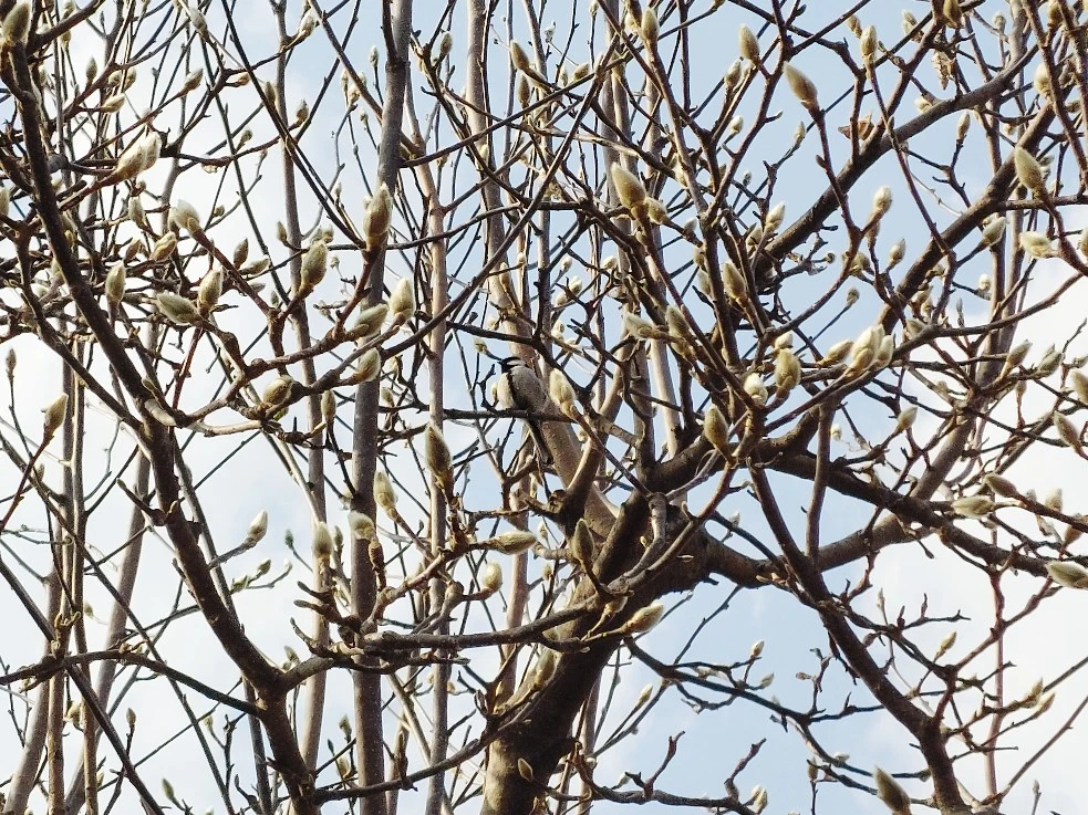마을 길을 걷는데 어쩐 일로 잘생긴 딱새가 멋진 포즈를 취해주고, 박새는 백목련 가지에 앉아 마치 털옷 입은 겨울눈인 것처럼 시치미를 뚝 떼고 있다.