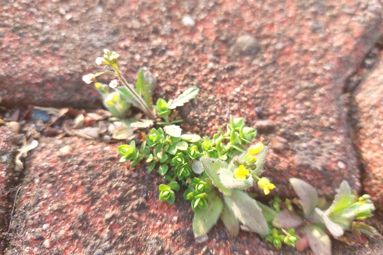 주차장 보도블록 틈으로 싹을 올린 냉이, 벼룩이자리, 꽃다지가 서로 자리를 다툰다. 냉이는 흰 꽃을, 꽃다지는 노란 꽃을, 벼룩이자리는 꽃을 기다리는 중인데 초록 잎이 장미꽃 같다. 저들끼리 사이가 어떤지는 몰라도 올망졸망 들꽃을 바라보는 나는 그저 흐뭇하다.