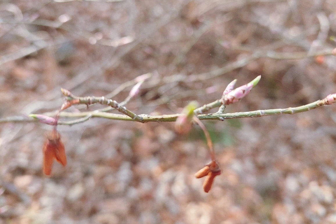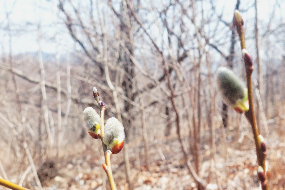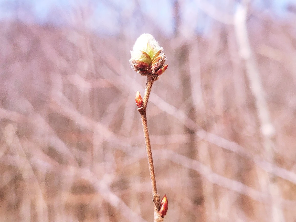 아직은 초록 기운 닿지 않는 산기슭, 화살나무 겨울눈이 분홍색 볼 터치를 한 것마냥 홍조를 띤다. 끝에 초록 잎을 살짝 물고 있다. 사르르 분홍 솜사탕 같은 고운 털에 덮인 덜꿩나무 겨울눈도 사랑스럽기 그지없다. 그러나 아직 갈색이 주를 이룬 숲은 차분하고 조용하다.