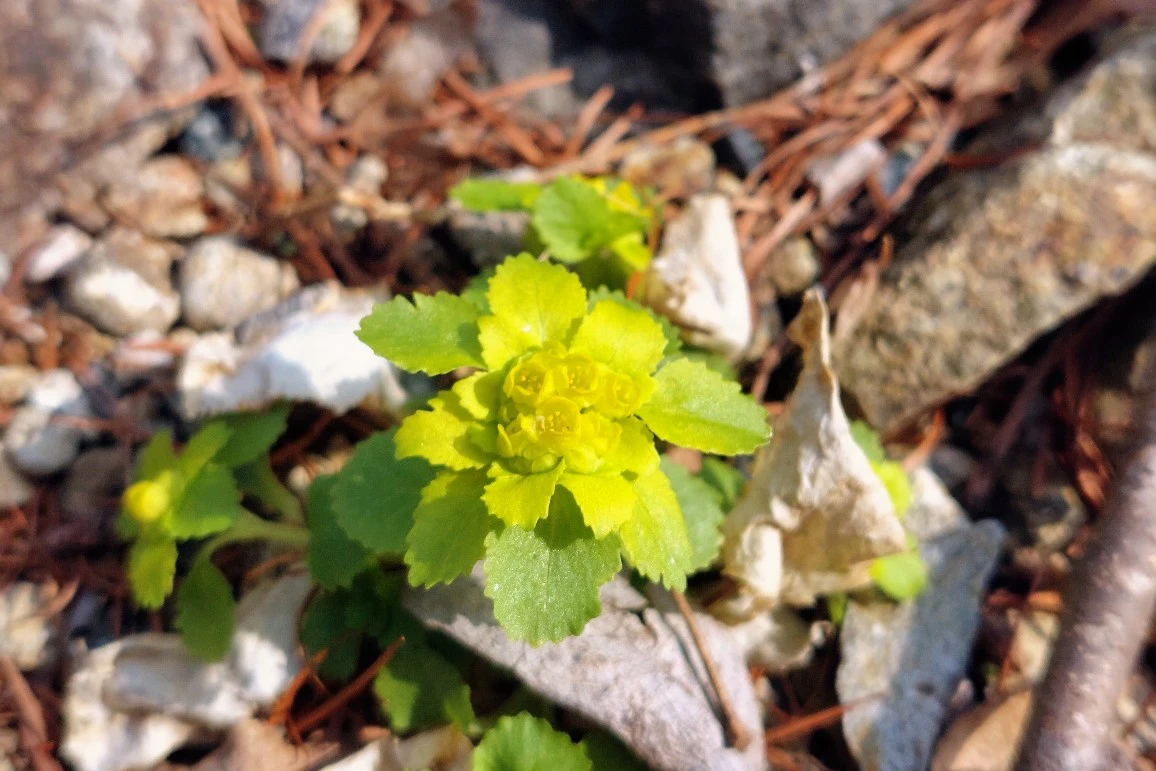 예전에는 징검다리를 건너 다녔는데 계곡 정비 후 아치형 다리가 여러 군데 생겼다. 그중 한 곳을 건너자 노란빛이 나를 끌어당긴다. 괭이눈이다. 꽃 주변 잎까지 노랗고 털이 없는 것이 선괭이눈인 것 같다. 올알옹알 작은 꽃 속에 노란 꽃밥이 앙증맞다. 숲 안쪽까지 노란빛이 점점이 흩어져 있다. 괭이눈을 따라 눈길을 옮기다 노루귀를 발견한다.