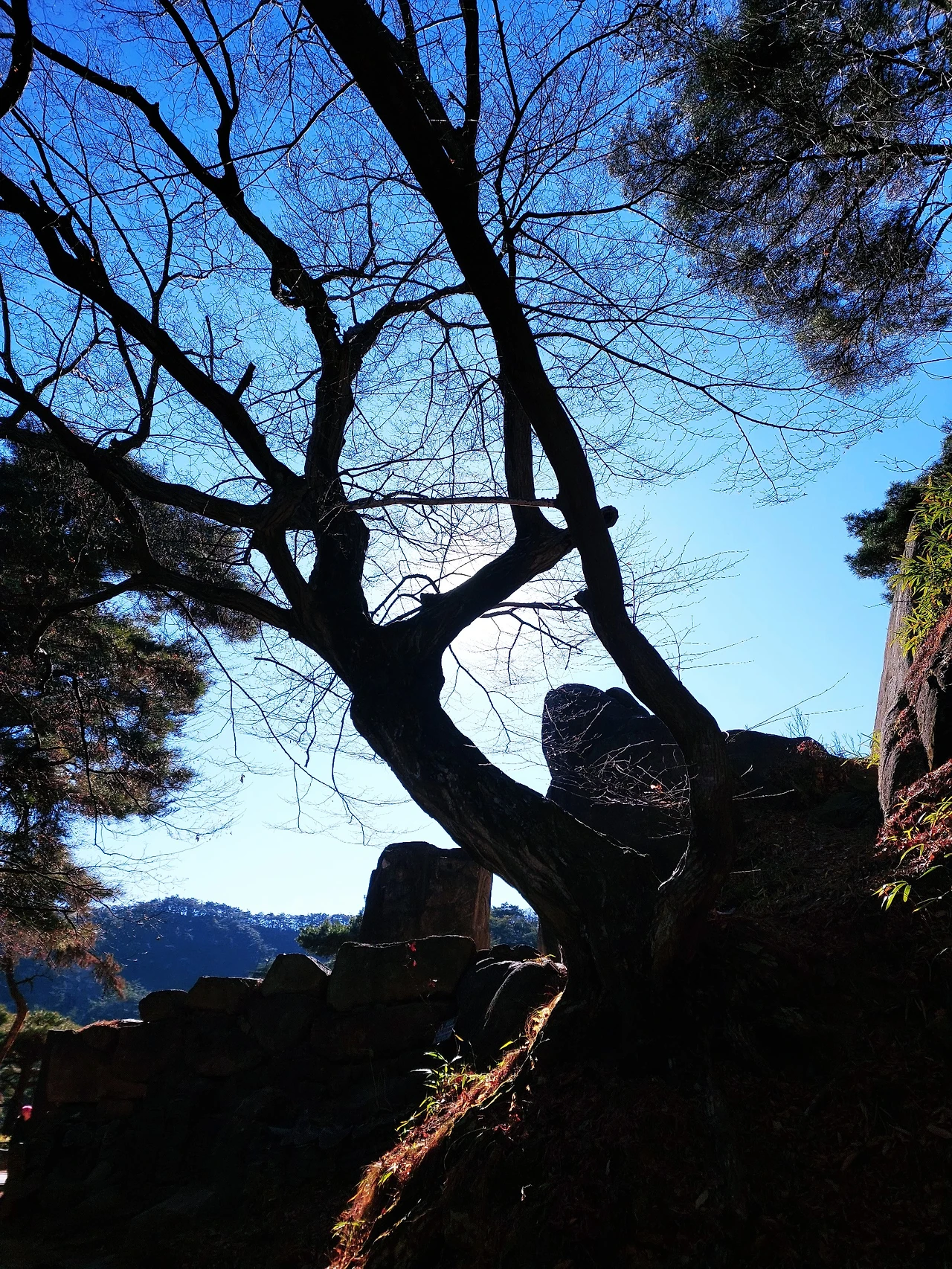 슬픈 무덤을 지나 오른쪽 길로 내려간다. 근거는 딱히 없지만 이 길이 맞구나라는 확신을 주는 길이다. 이번 겨울 들어 처음 싸하니 추운 산행이었는데 햇살 다사롭게 펼쳐져 마음 데펴진다. 왼쪽으로 새갓골이 보이고, 마지막 남은 의혹을 떨치고 걷자니 조망이 툭 트이는 바위가 나온다. 바위 병풍을 두른 곳에 아, 내가 올라온 길이 다소곳이 누워있고 골과 골이 겹친 것 같은 풍경이 드러난다. 바람이 사납게 불어댄다. 바람이 없다면 한참을 앉아 쉬었다 갔으면 싶은 곳이다. 한동안 서 있다가 돌아 나왔다.