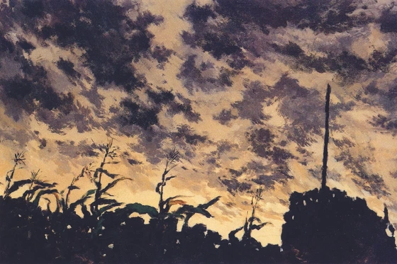 이 그림에서는 도저히 공존할 수 없을 것 같은 '안락함'과 '경각심'이 번갈아 느껴진다. 네발로 기는 동물의 시선을 표현한 것이 아닌 이상, 이런 각도로 하늘을 바라보려면 엎드려 고개를 치들거나 바닥에 비스듬히 누워야 한다. 그러니 이 그림은 몸이 땅에 바짝 붙어 자연과 가장 가까워진, 물리적으로는 어떨지 모르지만 심적으로는 인간이 돌아갈 곳인 자연으로 돌아간 듯한 '안락한' 상태에서 바라본 풍경이다. 그러나 해는 저물고 있고, 제목을 굳이 보지 않아도 연상되듯이 하늘에는 구름이 빠르게 흘러가고 있다. 옥수수들은 휘휘 방향을 바꿔가며 잎을 서로 부딪히며 유난을 떨고 있어 어서 집으로 돌아가야겠다는 '경각심'이 든다. 그런데 또 직접 보이지 않는 해는 저물지만 그 빛은 유난히 아련한 빛으로 인간 보편이 차분하고 잠잠해지는 그 시간으로 우리를 안내하고 있다. 옥수수의 상태로 보아 그리 춥지만은 않은 계절감과 옥수수밭이 가까이 있는 사람이 사는 동네라는 안도감이 다시 '안락함'을 준다.