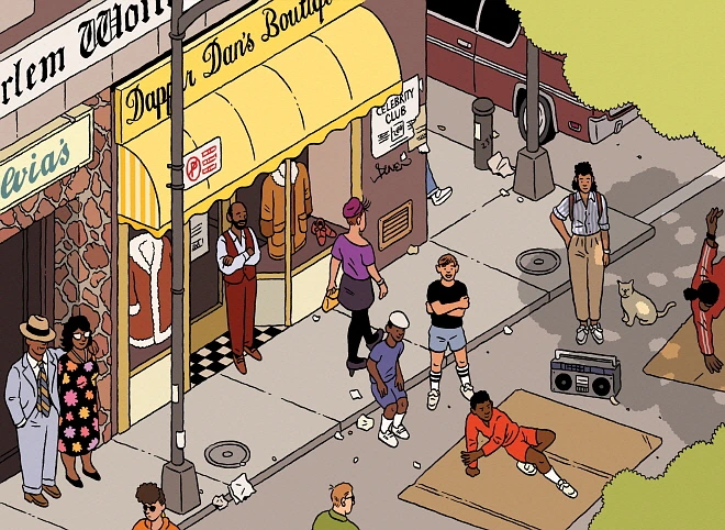 거리의 전경은 작가 본인이 실제 겪었던 맨해튼의 경치를 반영해 묘사한 것인데, 지역의 상징성, 색채를 살리는 동시에 다양한 문화가 공존하는 용광로(melting pot)로서의 뉴욕을 입체적이고 예리하게 구현했다.