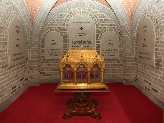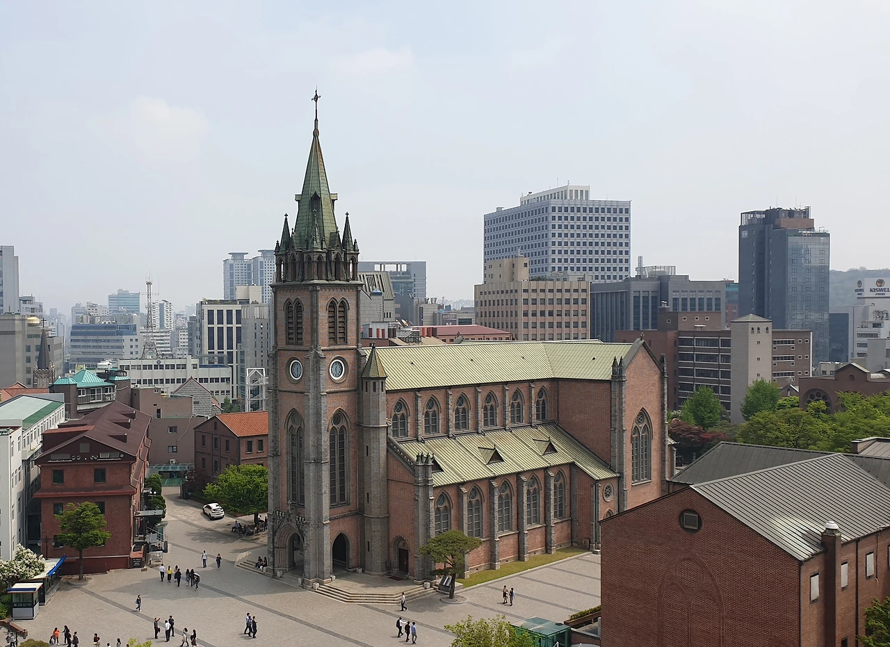 한국 가톨릭 교회의 중심인 서울 명동대성당. 프랑스 신부가 설계했고 그 지하엔 프랑스 선교사들의 유해가 있다.