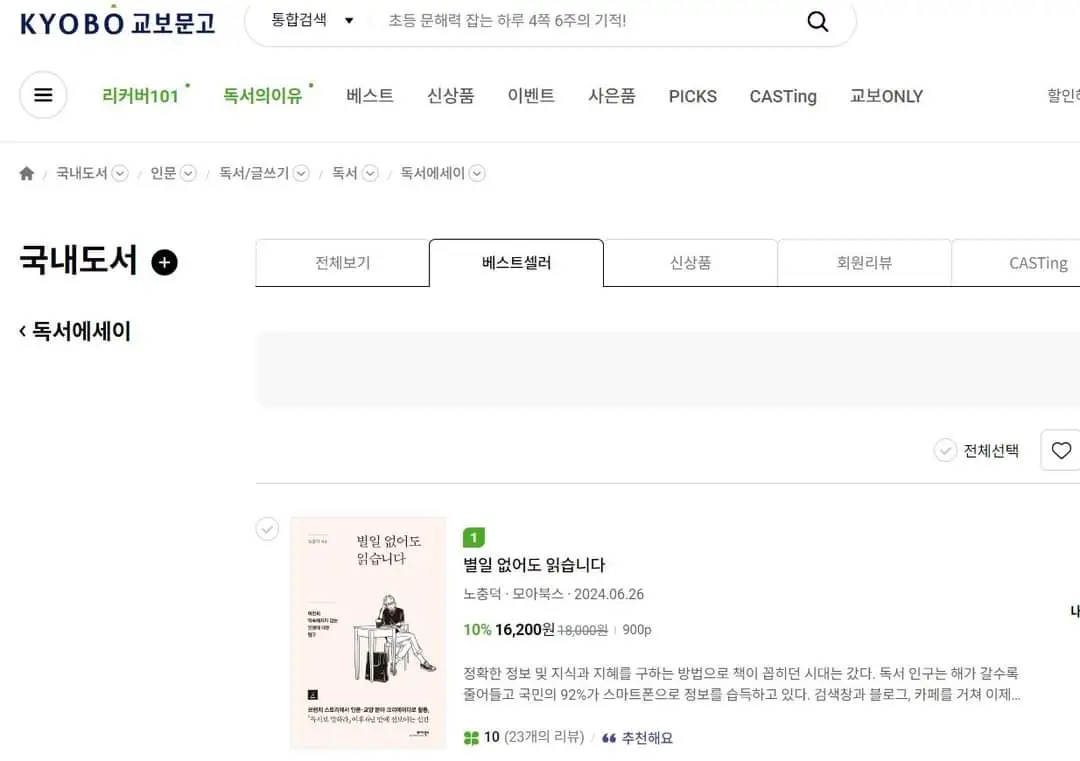 2024.8.5(월) 교보문고 인문/독서에세이 베스트셀러 1위 <별일 없어도 읽습니다>