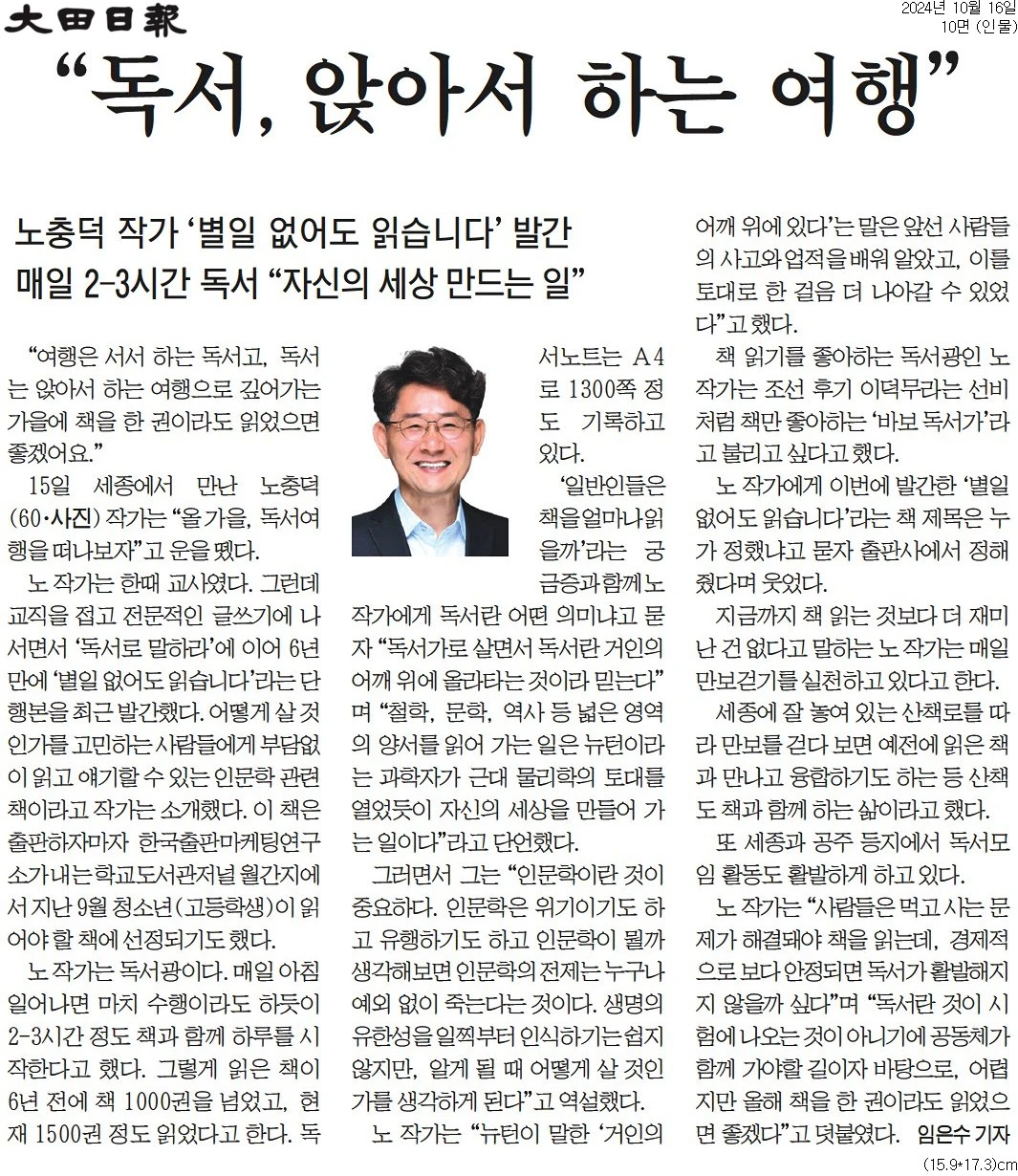 "여행은 서서 하는 독서고, 독서는 앉아서 하는 여행으로 깊어가는 가을에 책을 한 권이라도 읽었으면 좋겠어요." 15일 세종에서 만난 노충덕(60·사진) 작가는 "올 가을, 독서여행을 떠나보자"고