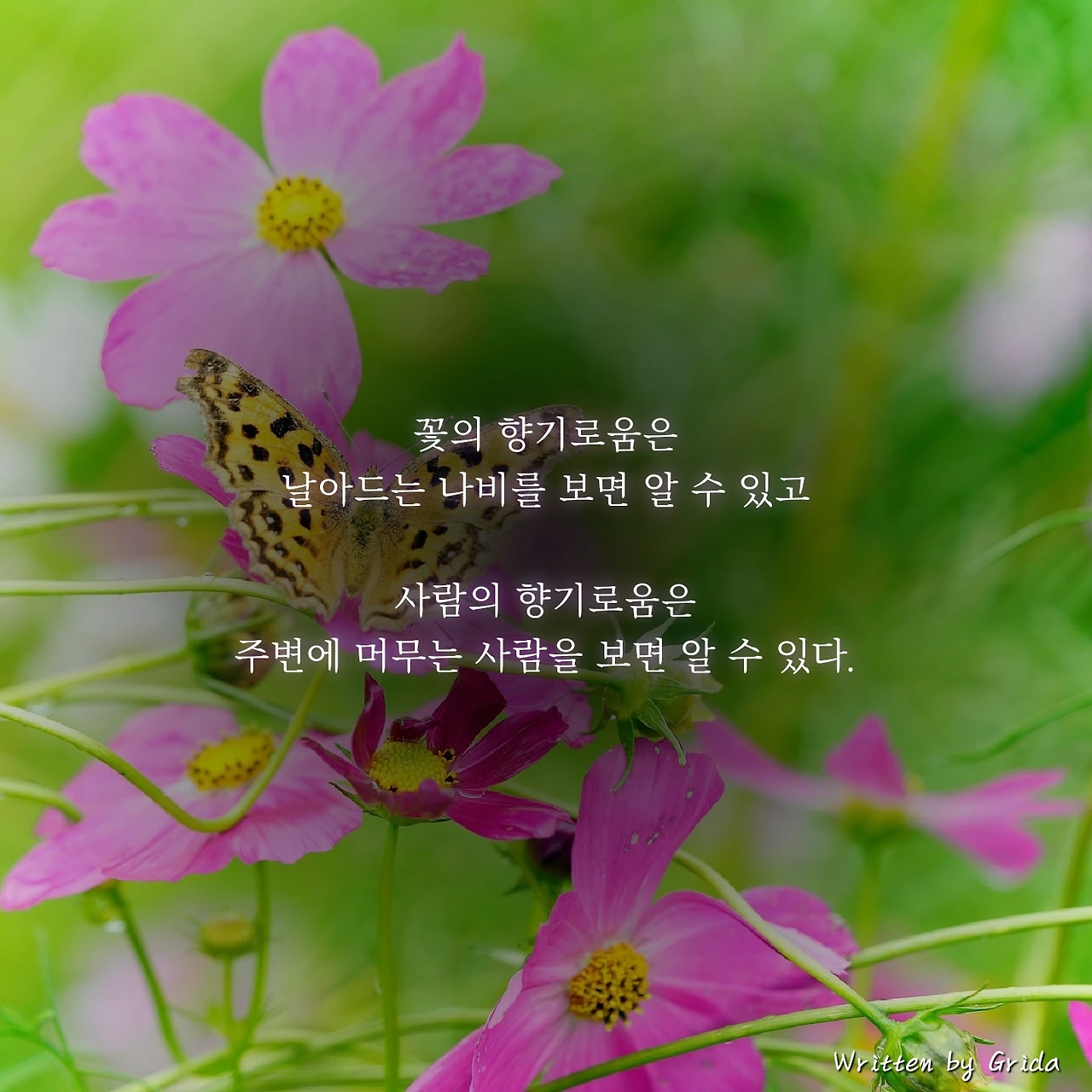 가을에 피는 코스모스는 바람이 불어도 나비가 날아와 그 위에 머문다. 그 이유는 코스모스가 형태뿐만 아니라 지니고 있는 향기마저 아름답기 때문이다.
