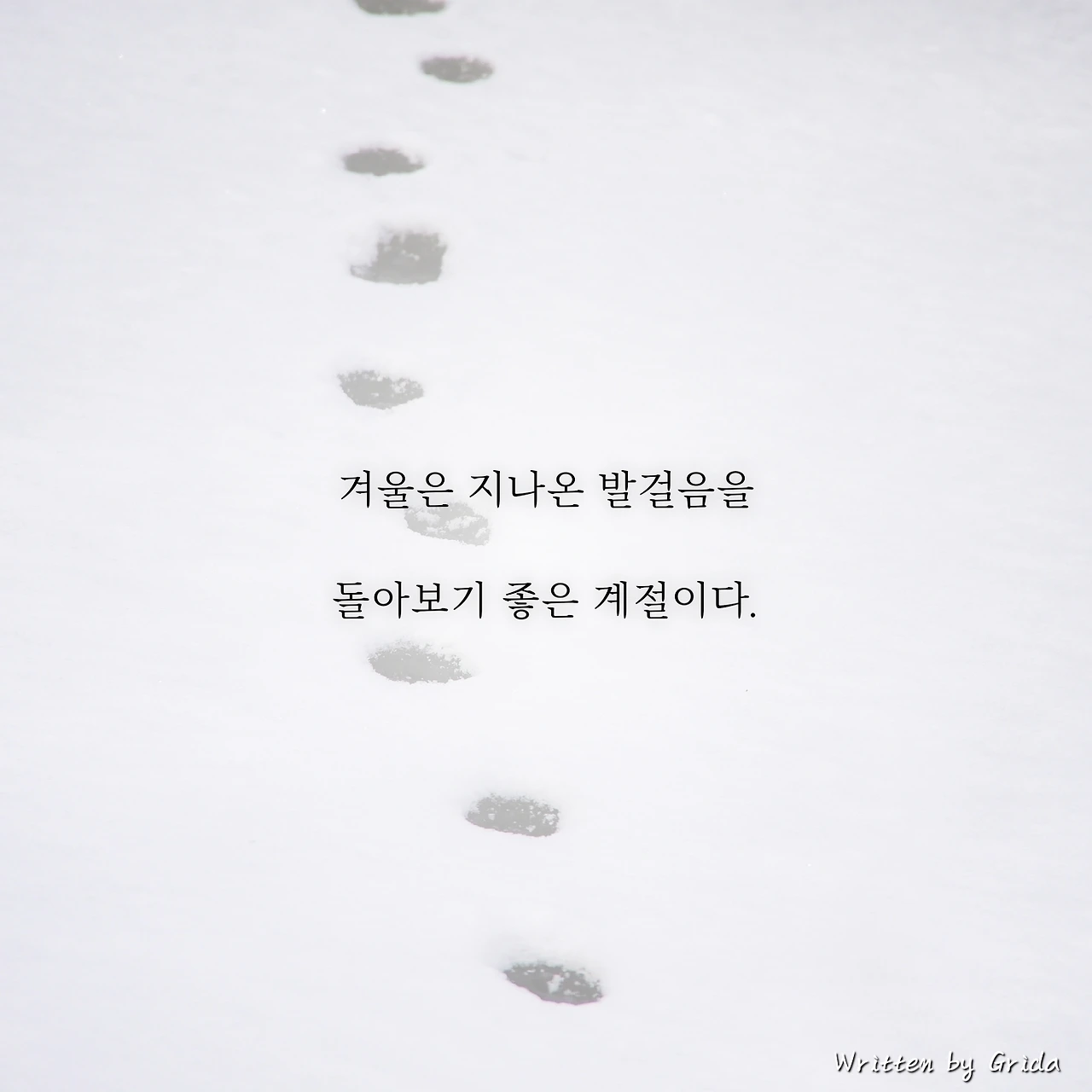 세상이 하얗게 물들어가는 겨울은 지나온 발걸음을 돌아보기 좋은 계절이라는 생각이 든다. 한 해의 마지막을 장식하기도 하면서 새로운 한 해로 이어지는, 연결고리와 같은 역할을 하는 계절이기에. 그리고 다른 계절은 비가 내리거나 낙엽이 떨어져 발걸음을 볼 수 없지만, 겨울은 소복이 쌓인 눈 위로 내 발자국이 또렷이 남게 되기에 더욱 그렇다는 마음이 든다.