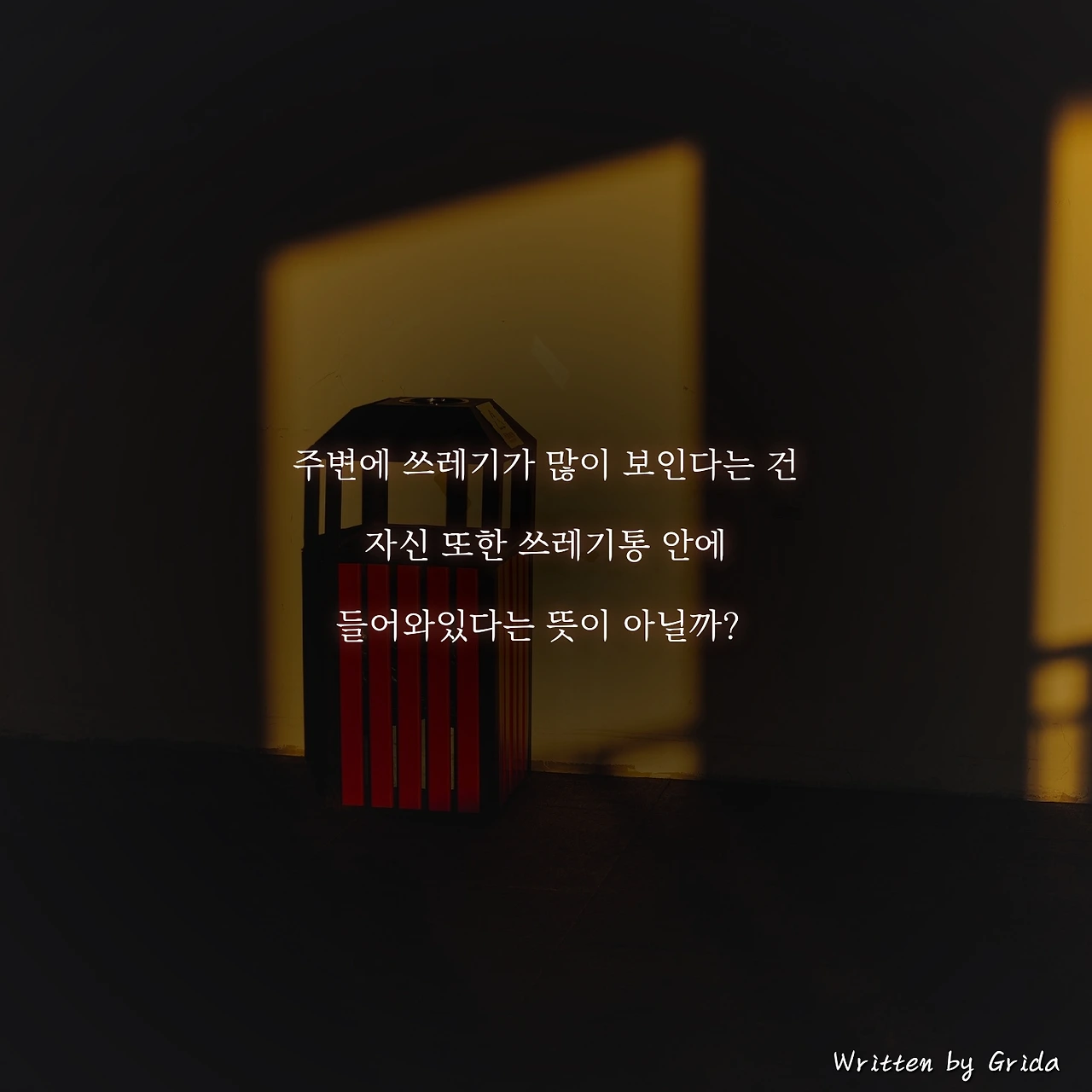 나는 그런 손쉽고도 안일한 모습을 보면서 생각했다. 주변에 쓰레기가 많이 보인다는 것은, 자신 또한 그런 잡동사니들이 모인 쓰레기통 안에 들어있는 것이라고.