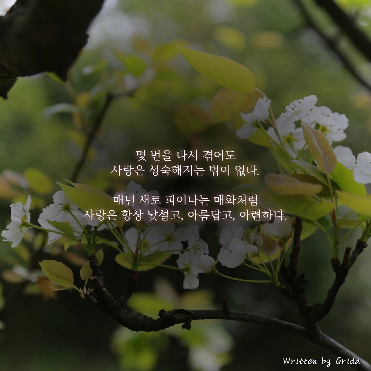 하지만 나는 이런 마음들을 보며, 사랑이란 몇 번을 다시 겪어도 결코 성숙해지지 않는다는 말을 해주고 싶다. 매년 이른 봄에 피어나는 매화처럼, 사랑은 시작할 때마다 매번 낯설고, 아름답고, 또 아련하기 때문이다.