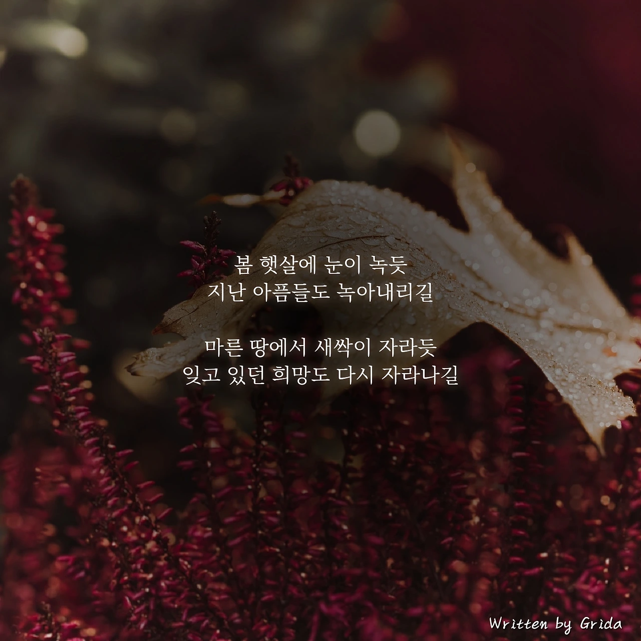 밤이 길었던 계절이 지나 다시금 낮이 긴 계절이 찾아오면, 나도 못 이긴 척 계절을 따라 아주 조금만 밝아져야겠다. 마른 땅에서 새싹이 자라듯, 잊고 있던 희망들도 다시 고개를 들길 바라면서.