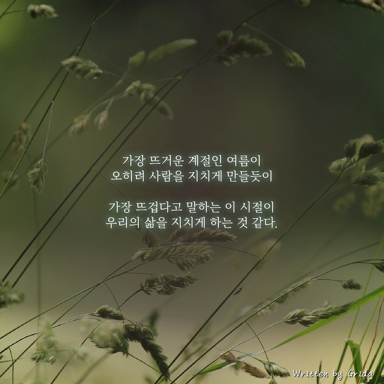 다만 내가 요즘 느끼는 것은 그런 찬란한 순간이 언제나 우리에게 힘을 주지 않는다는 것이다. 마치 뜨거운 햇볕이 내리쬐는 여름날이 우리에게 피곤함과 지친 하루를 선사할 때가 있듯이, 우리의 뜨거운 시절도 하나의 원동력이 되기보다는 맹목적인 목표를 강요하며 그저 피곤함과 힘듦을 안겨주는 시간들이 되는 게 아닌가 하는 생각이 든다.