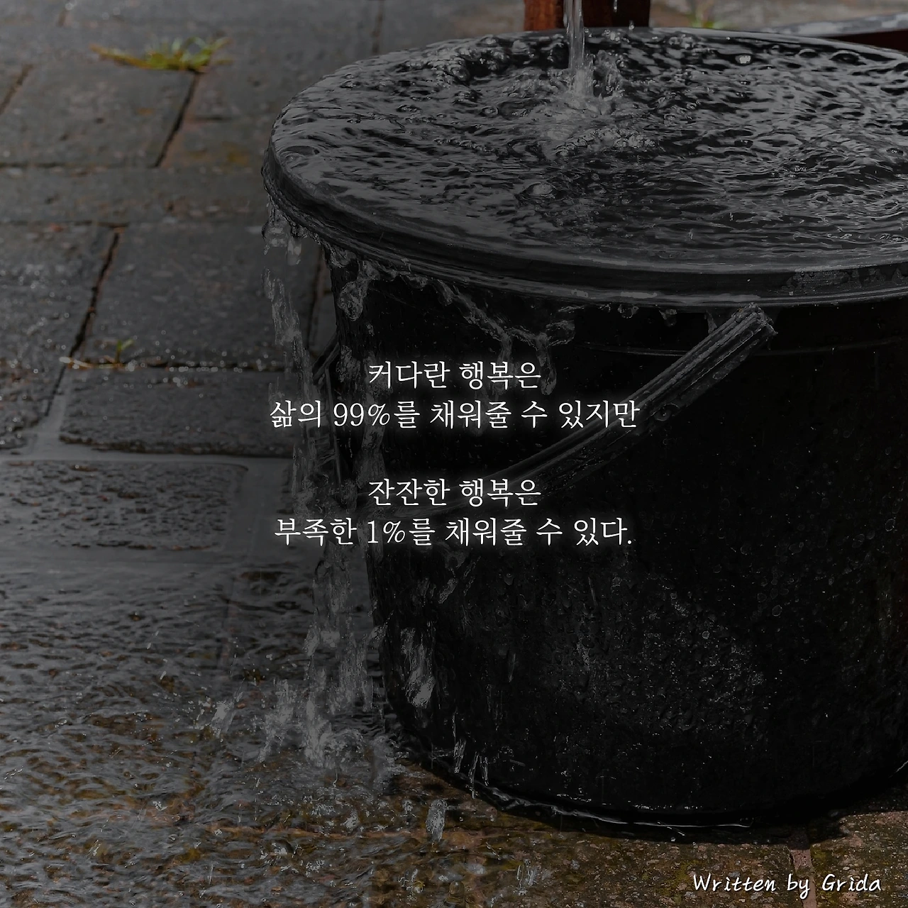 사람의 행복도 그렇다. 폭포처럼 쏟아지는 행복은 대부분의 빈 마음을 채우기 좋지만 완전히 채워주지는 못한다. 결국 마지막에 오게 되는 1%의 아쉬움을 채우기 위해서는 그 삶에 잔잔하게 흘러드는 소소한 행복이 필요하다.
