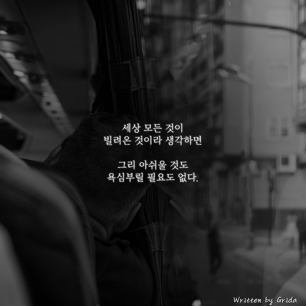 또 그러다가 고개를 돌려, 어차피 지금 내 삶도, 누리는 시간도 모두 빌려온 것이라 생각하면 딱히 저것이 내 것일 필요는 없겠구나 싶은 마음에 피식 웃음이 지어진다.