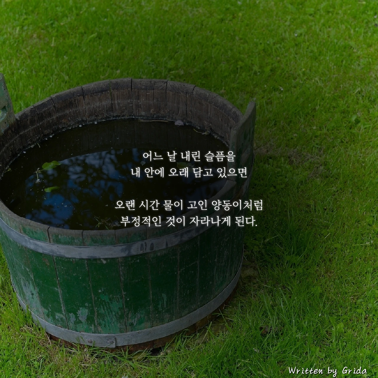 소나기로 인해 물이 차게 된 양동이를 오랜 시간 가만히 두면 그 안에 탁한 이끼가 생기고, 나쁜 벌레도 꼬인다. 그처럼 우리의 마음도 어느 날 내린 슬픔을 오래 담고 있으면 그 안에서 부정적인 것이 자라나 그 삶을 어지럽히게 된다.