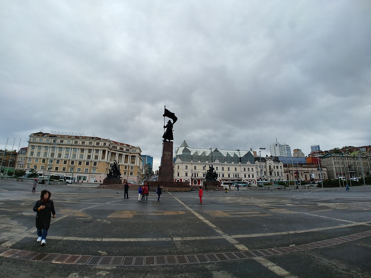 이튿날 아침에는 블라디보스토크의 대표적인 유적 중 하나인 중앙광장을 방문했다. '혁명전사광장'이라고도 불리는 이곳은 평소에는 일반 시민들의 휴식처가 되고 있고, 국경일에는 별도의 행사로 북적이는 공간이 되기도 한다. 내가 방문한 날에는 전날 내린 눈으로 인해서 바닥이 젖어있었는데, 하늘도 흐려서 그런지 무언가 휑한 느낌이 들었다.