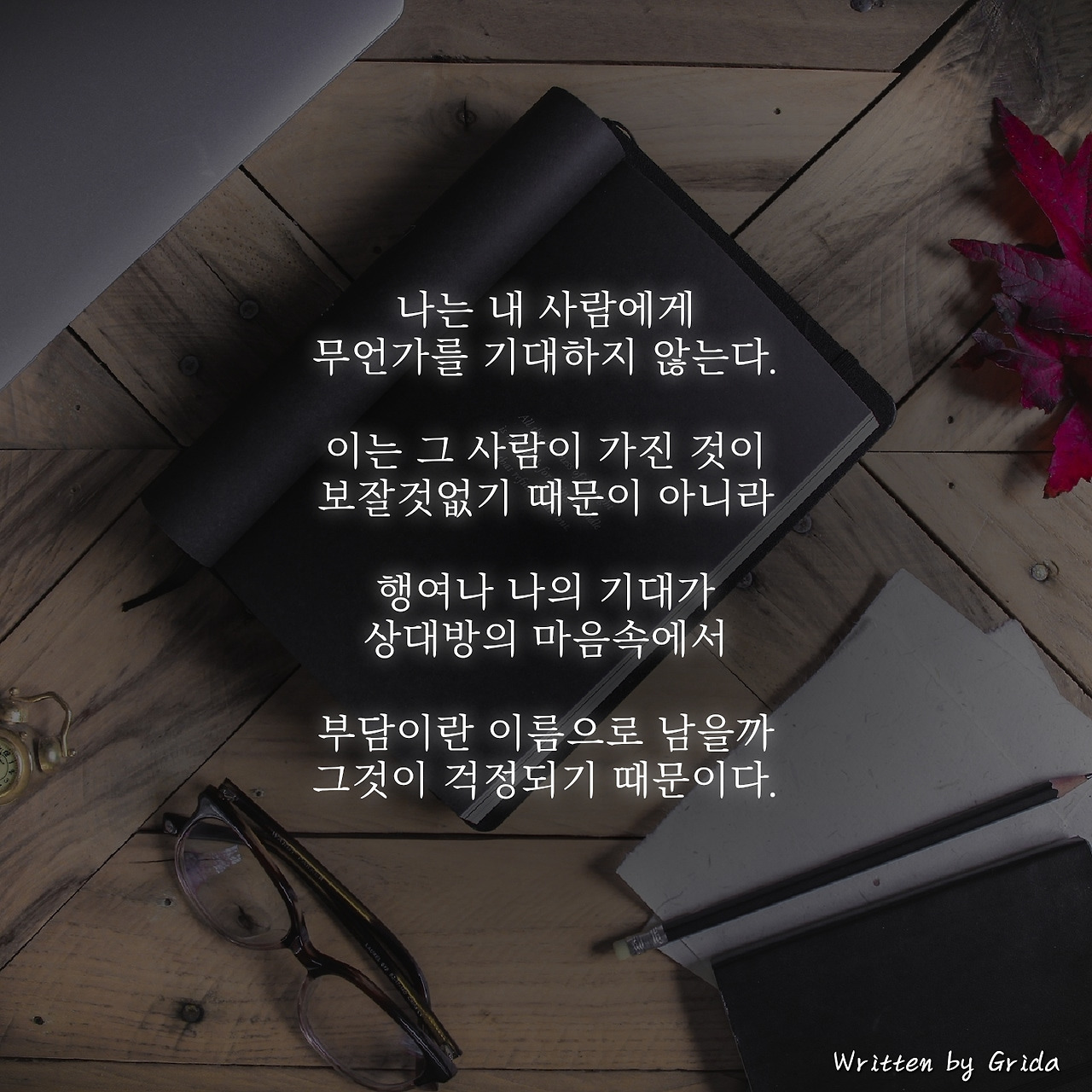 나는 내 사람에게 무언가를 기대하지 않는다. 그 이유는 상대방이 가진 것이 보잘것없기 때문이 아니라 나의 기대로 인해서 상대방이 행여 부담을 가지게 될까 그것이 염려되기 때문이다.