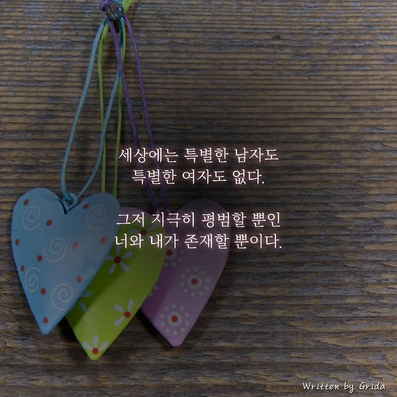 사람들은 무언가 자신과 다르거나 특별한 사람을 만나길 바라지만 거울로 자신의 모습을 바라보면 알 수 있듯, 세상에는 그리 특별한 남자도, 그리 특별한 여자도 존재하지 않는다.