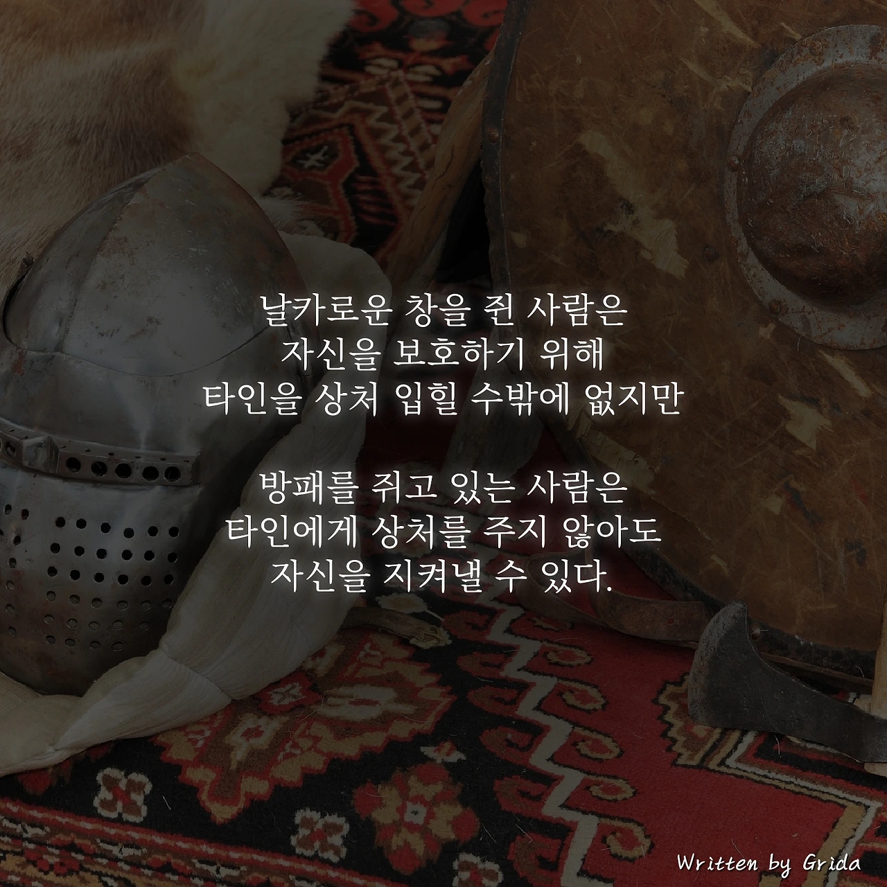 손에 날카로운 창을 쥐고 있는 사람은 자신을 보호하기 위해서 타인을 상처 입힐 수밖에 없지만, 방패를 쥐고 있는 사람은 타인에게 상처를 주지 않아도 자신을 지켜낼 수 있다.
