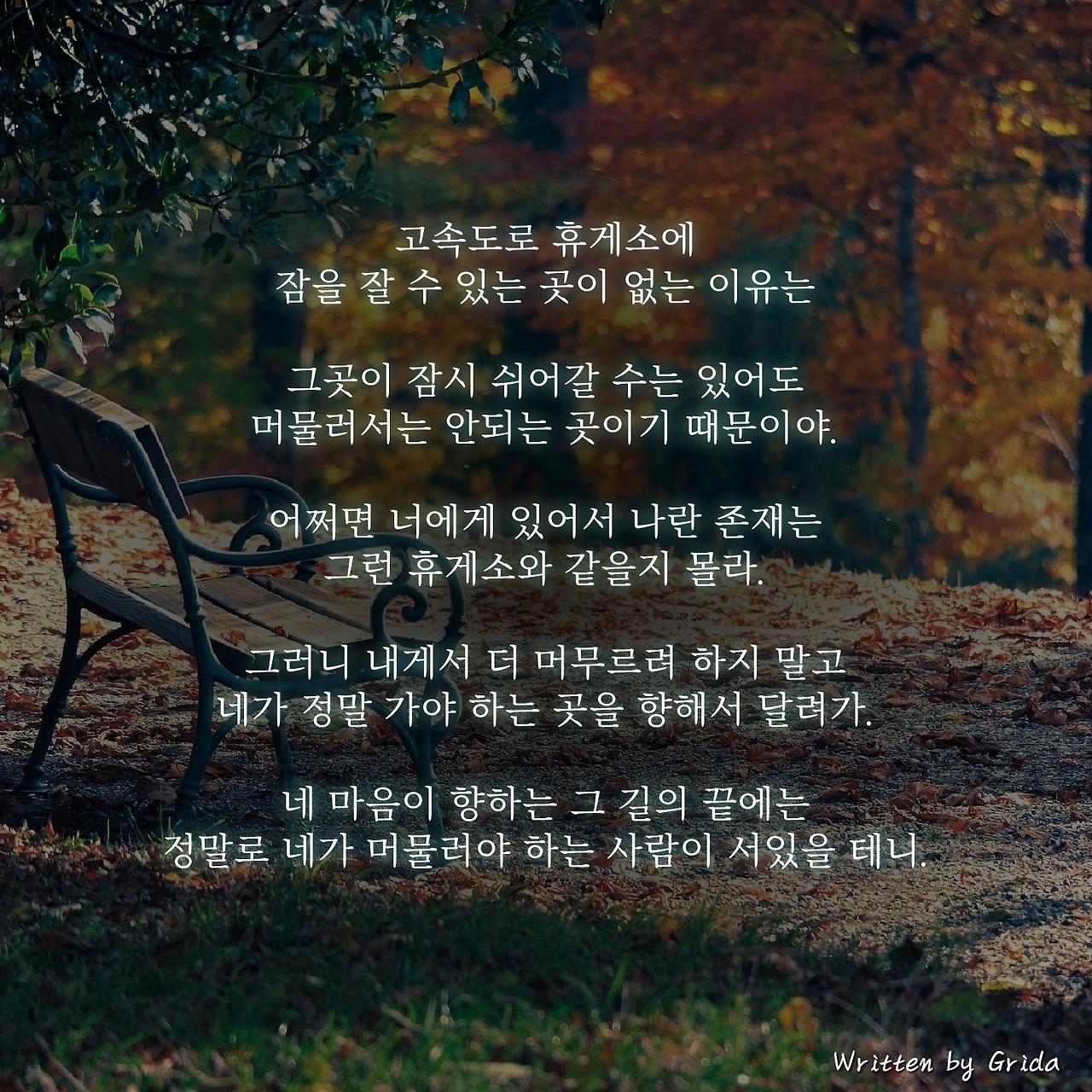 고속도로 휴게소에 잠을 잘 수 있는 곳이 없는 이유는 그곳이 잠시 쉬어갈 수는 있어도 머물러서는 안되는 곳이기 때문인 것처럼, 너에게 있어서 나란 존재는 그런 휴게소와 같을지 몰라.