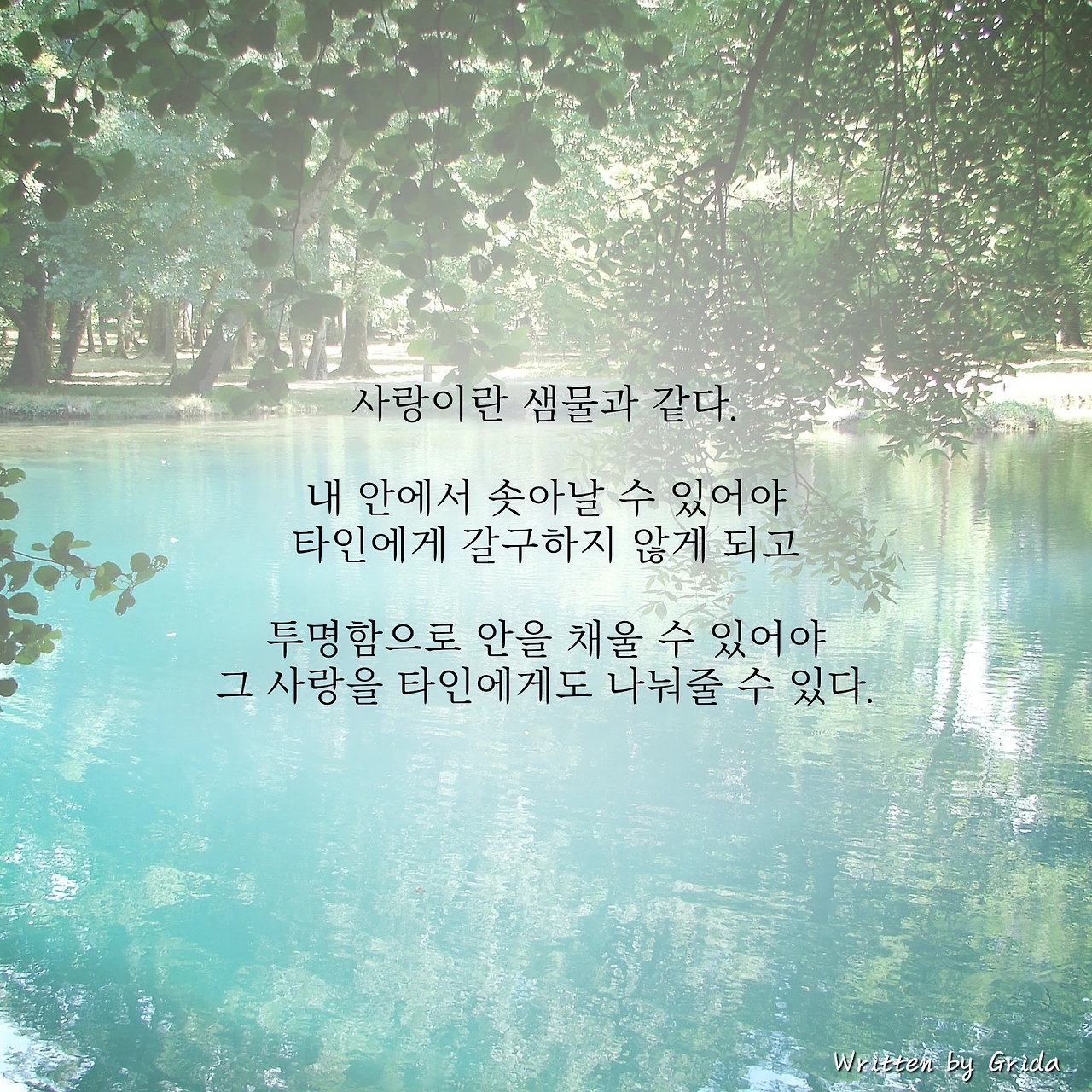 또 넘쳐나는 물이라도 투명하지 않으면 그 누구도 샘물을 마실 수 없듯이, 사랑도 그 안을 순수함과 투명함으로 채우려는 노력이 있어야지만이 누군가에게 올바르게 나누어 줄 수 있다고 본다.