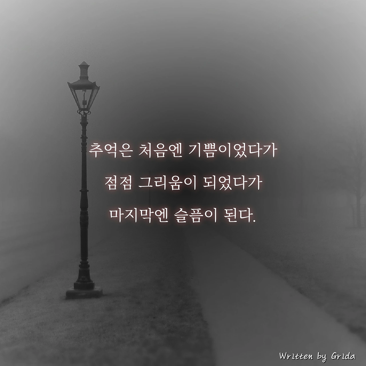 추억이라는 것은 참 신기하다. 추억과 오늘의 거리가 가까울 때는 기쁨으로 남고, 점점 시간이 흘러갈수록 그리움이 되었다가 되돌릴 수 없다는 것을 깨닫게 되는 마지막 순간에는 그 감정이 슬픔으로 자리 잡게 된다.