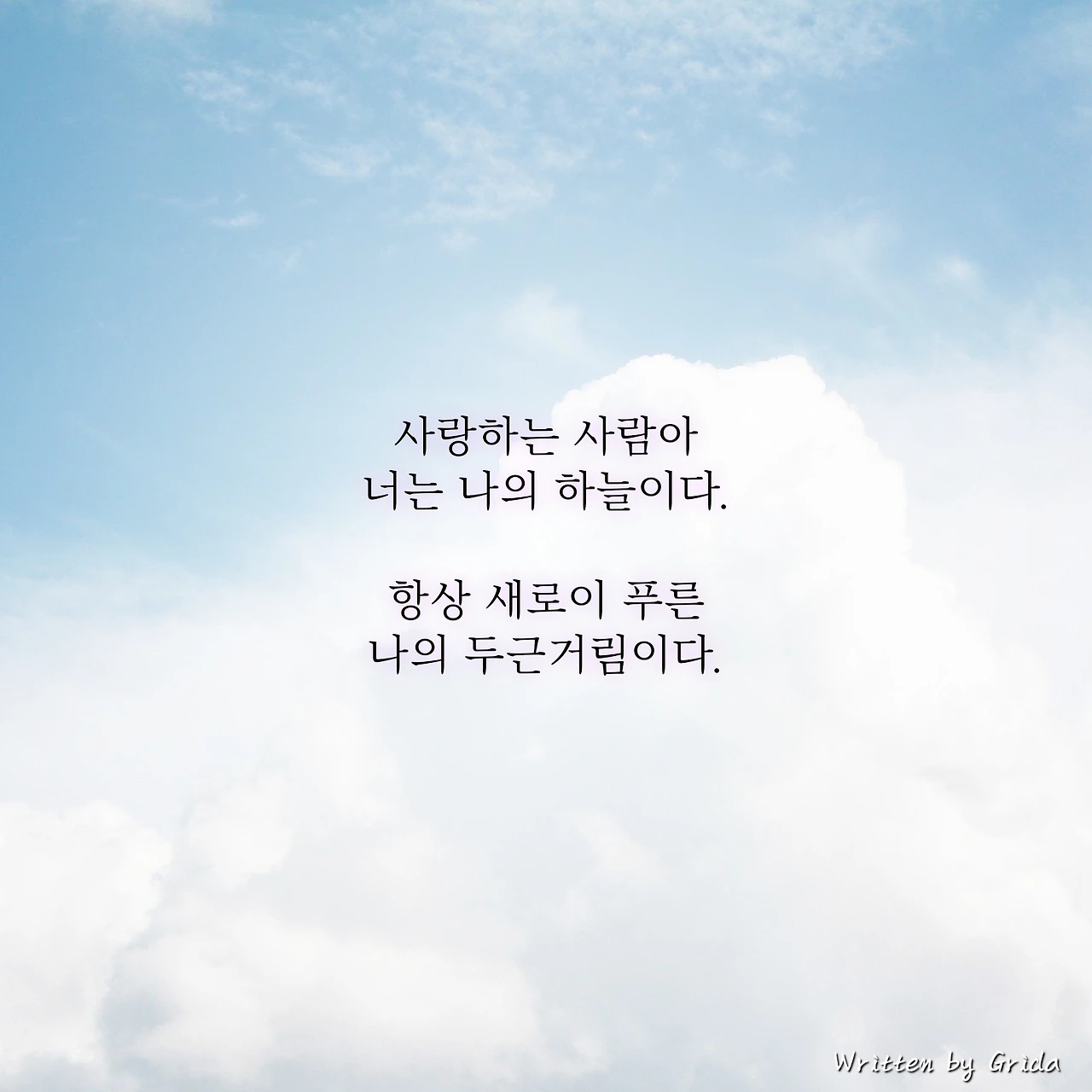 사랑하는 사람아 너는 나의 하늘이다. 저 높은 하늘처럼, 흘러가는 구름처럼 내 마음속에서 항상 새로이 푸른, 나의 두근거림이다.