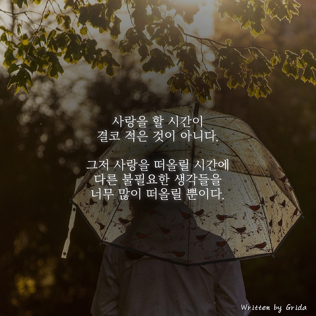 사랑을 표현해야 할 시간에 너와 나의 차이를 따지고 누가 잘했느냐 못했느냐의 이해관계만을 떠올리고 있으니, 그런 불필요한 생각들 때문에 사랑을 떠올리지 못하고 있을 뿐이라는 생각이 든다.